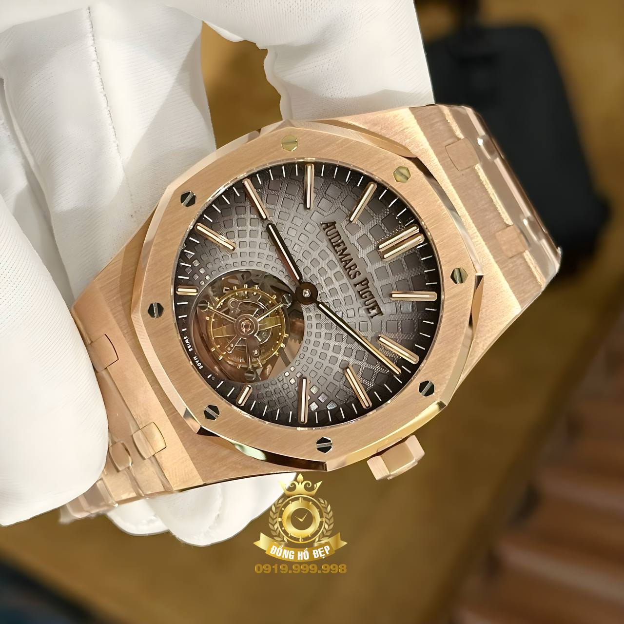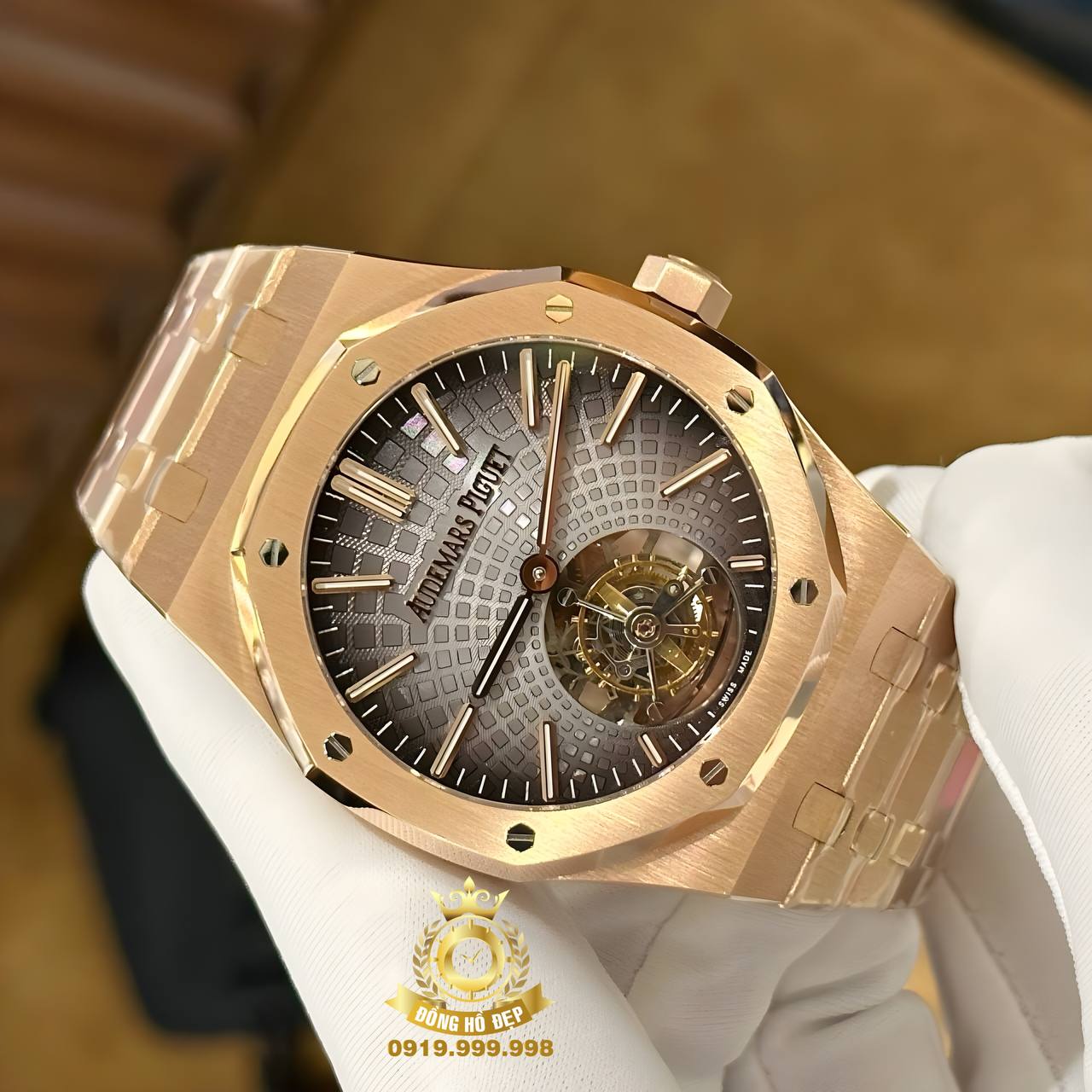 Đồng Hồ Audemars Piguet Royak Oak Tourbillon Replica 1 1 Cao Cấp Nhất là mẫu đồng hồ sao chép cao cấp nhất đến từ thương hiệu AP, có kích cỡ mặt số 41 mm dành cho các quý ông lịch lãm. Chiếc đồng hồ sử dụng bộ máy tự động có xuất xứ Thụy Sĩ, đồng hồ có thể vận hành trong thời gian dài, có độ bền và giá trị sưu tầm cao. Chất liệu vỏ được chế tác từ thép mạ vàng hồng, chất liệu sang trọng trong giới đồng hồ. Đồng hồ Audemars Piguet luôn là khao khát của người chơi đồng hồ. Đồng hồ được trang bị dây kim loại bền bỉ, lịch lãm. Chất liệu kính làm từ Sapphire đem lại khả năng chống xước, chống lóa tuyệt vời.
