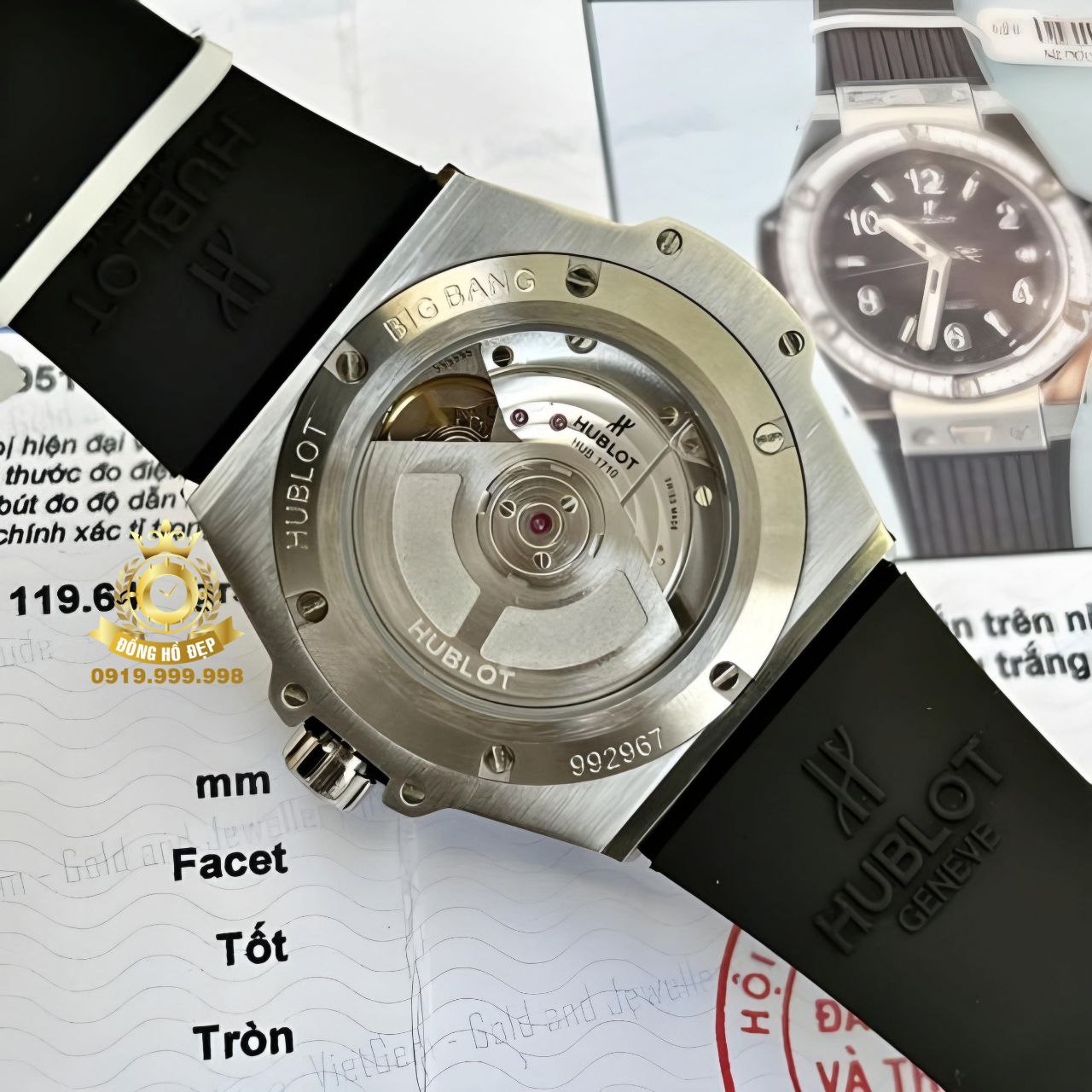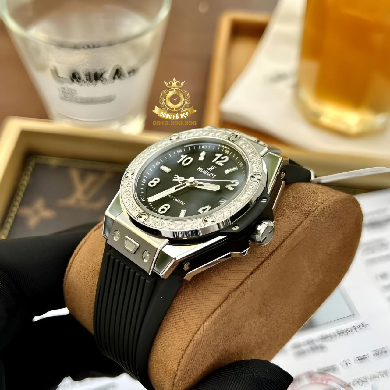 Vành bezel tròn được cố định vững chắc lên vỏ bằng 6 chiếc đinh vít titan hình chữ H – một biểu tượng quen thuộc trong thế giới đồng hồ Hublot.