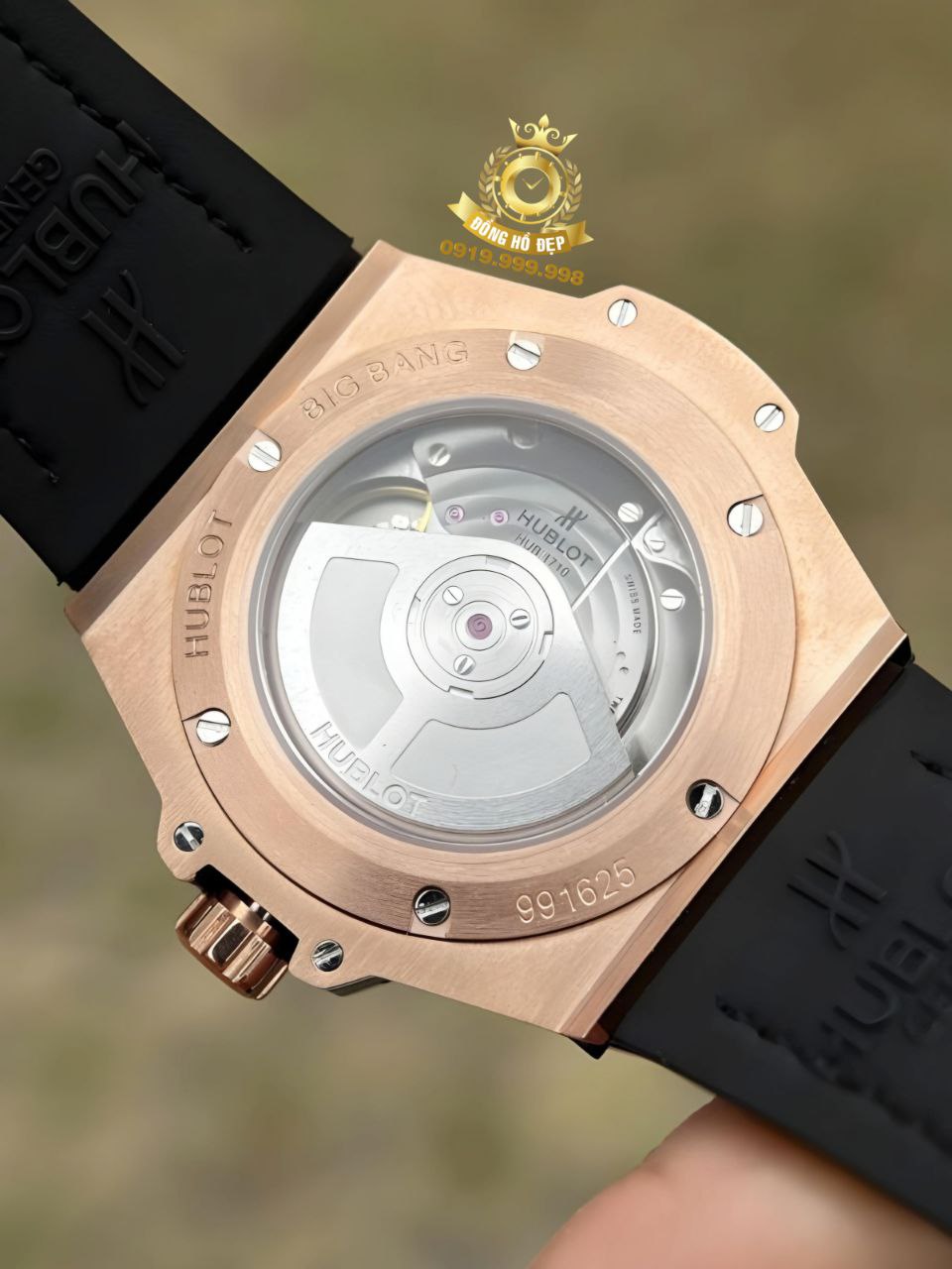 Vành bezel tròn được cố định vững chắc lên vỏ bằng 6 chiếc đinh vít titan hình chữ H – một biểu tượng quen thuộc trong thế giới đồng hồ Hublot.