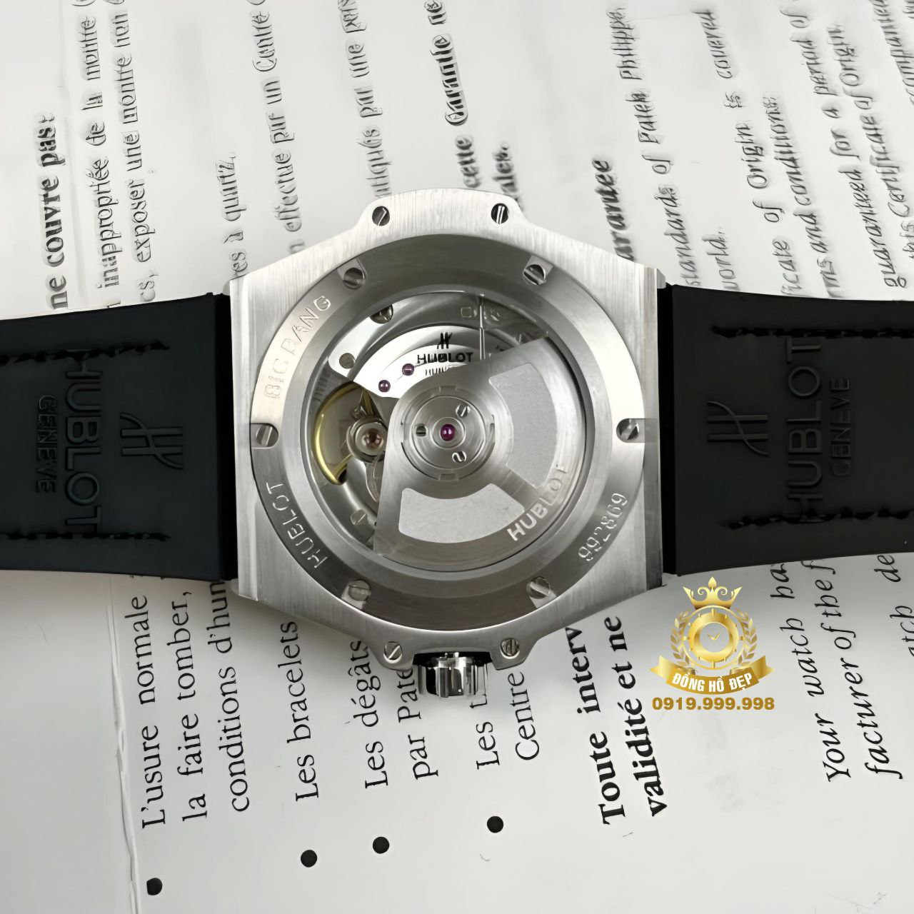 Dòng chữ Hublot nằm ở vị trí 12 giờ, cùng với kim dây thiết kế theo biểu tượng chữ H tại vị trí cuối cùng – tất cả đều là những nét đặc trưng thường thấy trên đồng hồ Hublot. Đồng Hồ trang bị bộ máy lên cót tự động . Với 25 chân kính, hoạt động ở tần số 28.800 vph và khả năng trữ cót tốt, thời lượng trữ cót của bộ máy lên đến 42 giờ. Bộ máy thực hiện các chức năng cơ bản như báo ngày, giờ, phút và giây.