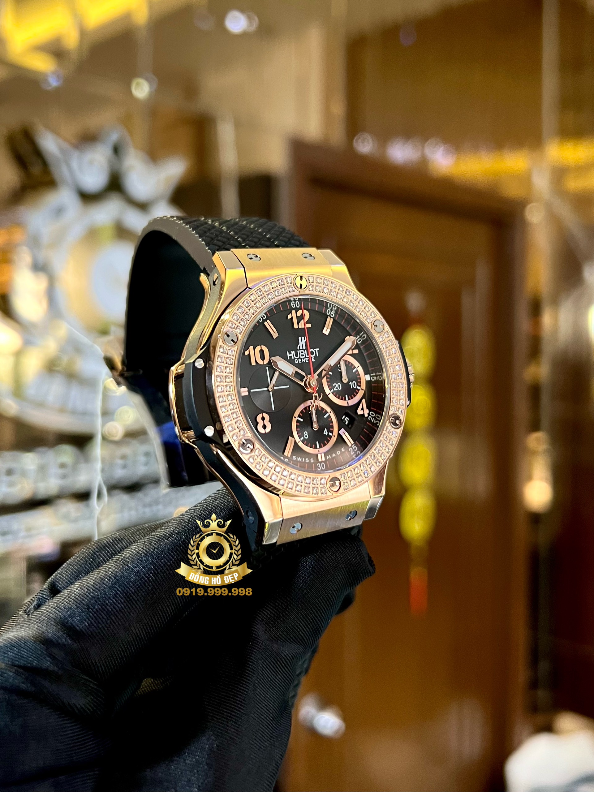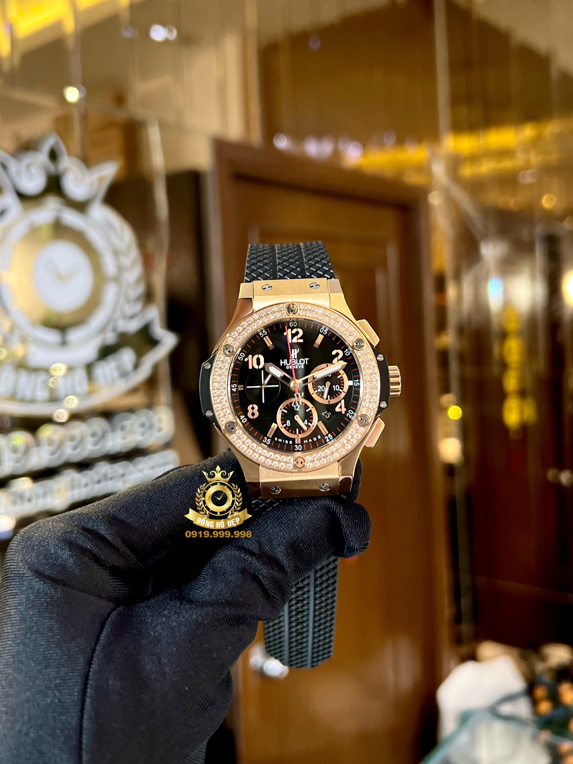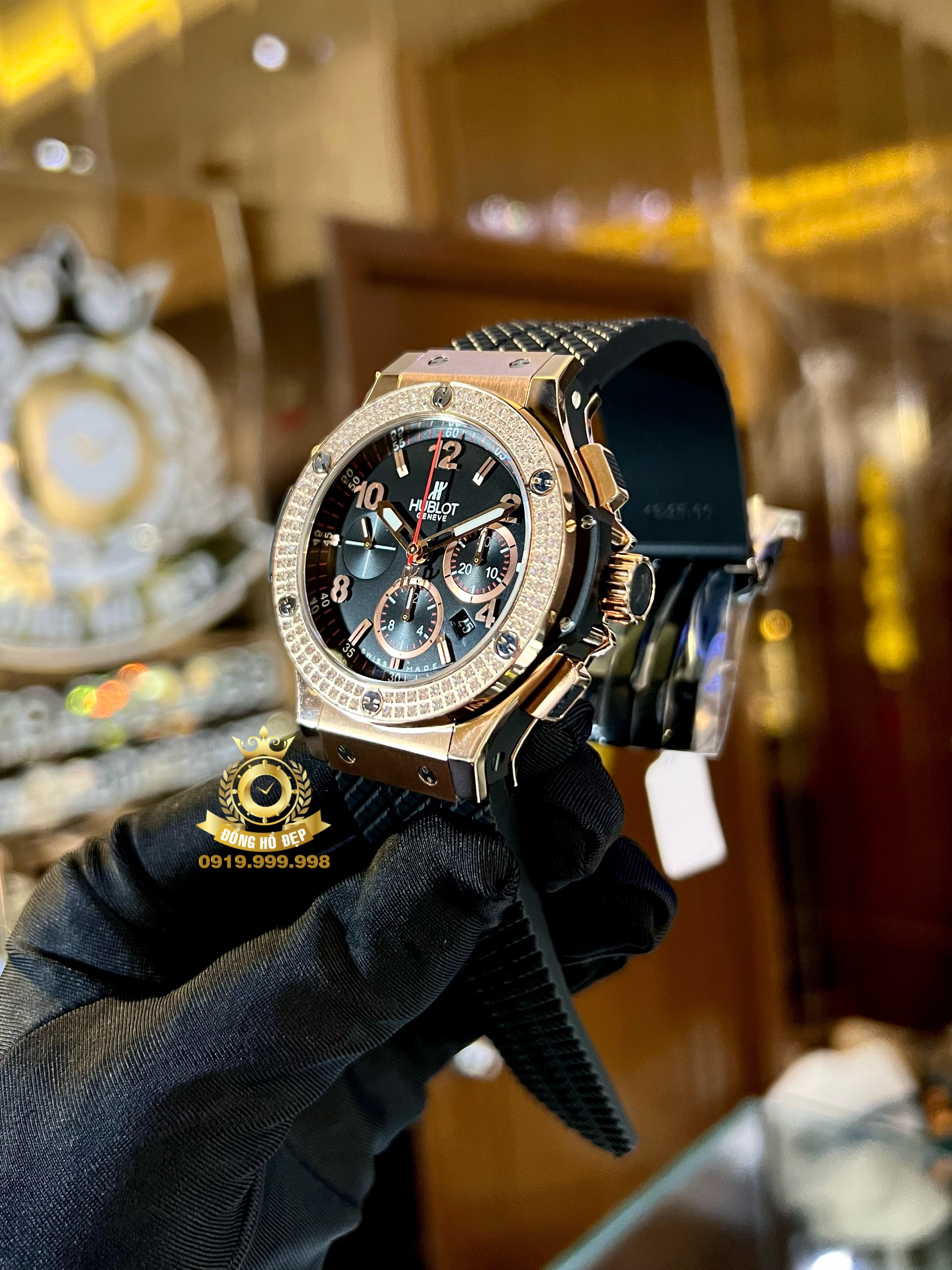 Nhắc đến Hublot – Big Bang chúng ta sẽ nghĩ ngay đến một cỗ máy gắn đầy kim cương. Hublot cho biết họ đã sử dụng 1280 viên kim cương trọng lượng ít nhất của mỗi viên là 3 carats. Phải mất hơn 1 năm để tìm ra những viên kim cương này từ tất cả mọi nơi trên trái đất, và kết quả mang lại hoàn toàn xứng đáng. Mỗi viên đá được cắt bởi một thợ kim hoàn nổi tiếng từ New York, với hơn 40 năm kinh nghiệm, để đảm bảo mỗi chiếc đều có chữ ký giống nhau.