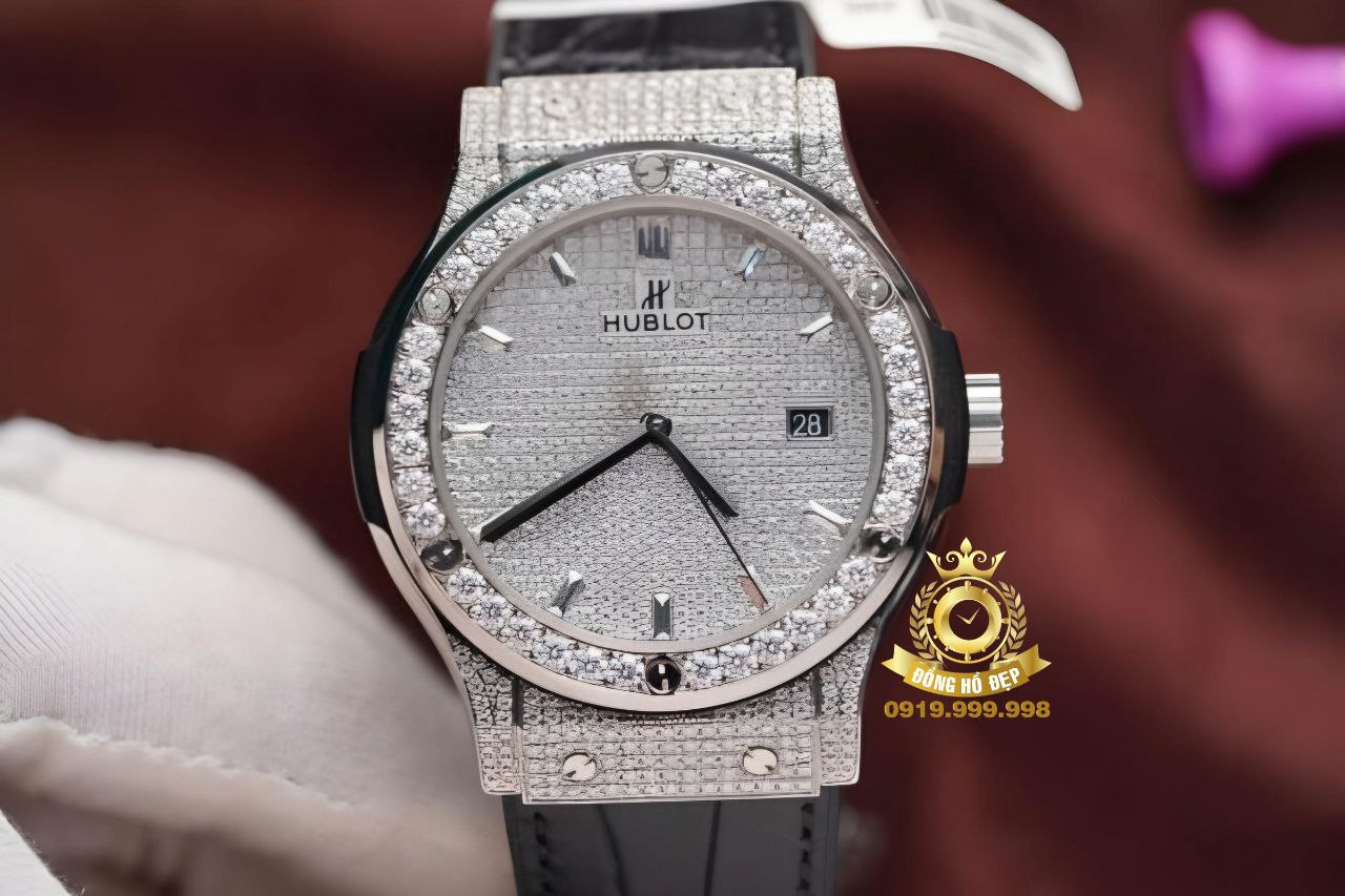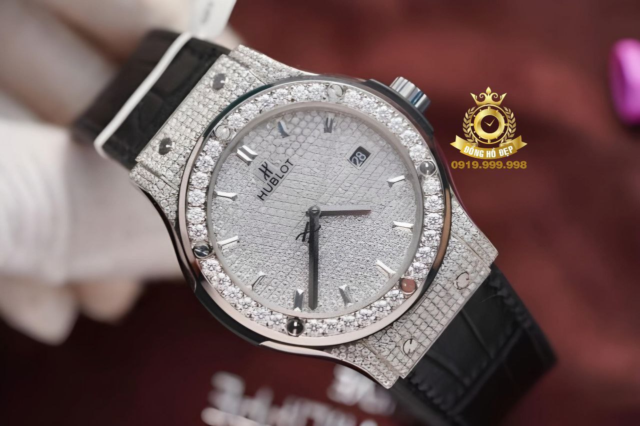 Đánh giá Hublot Classic Full Moisssanite JJF Dial Silver Black Rubber.