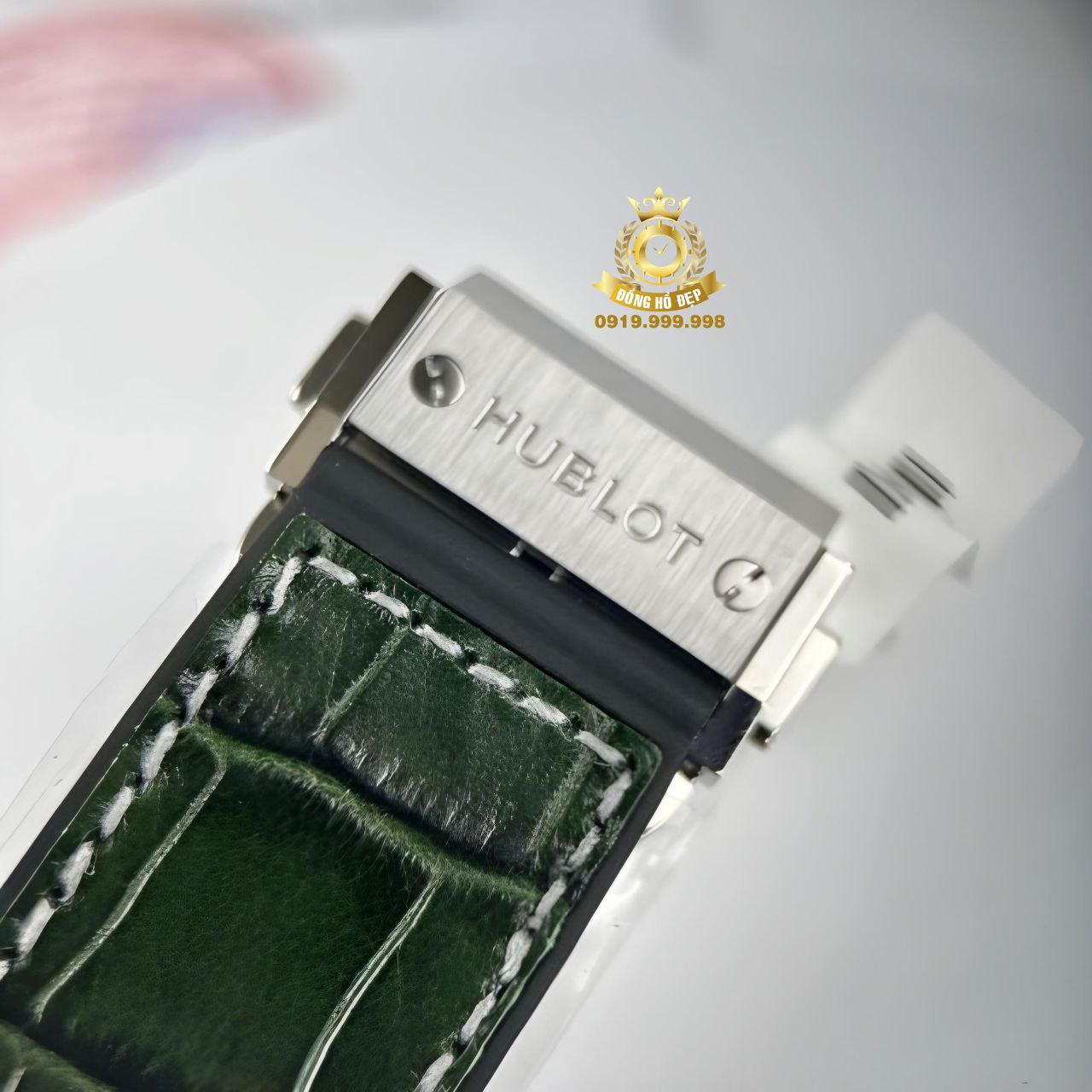 Mặt kính đồng hồ Hublot được làm từ tinh thể sapphire trong suốt có khả năng chống xước và chống phản quang tốt. Dây đeo đồng hồ kết hợp giữa chất liệu da vân cá sấu và cao su cao cấp để tạo sự thoải mái nhất cho quý ông khi đeo đến những sự kiện khác nhau.