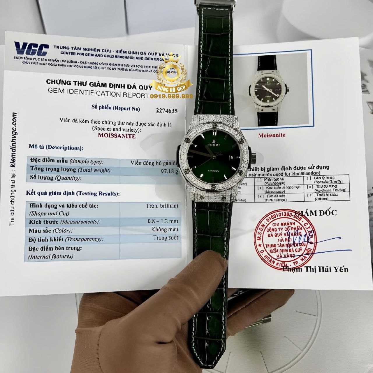 Đánh giá Hublot Classic Fusion Green Titanium Full Moissanite Dial.