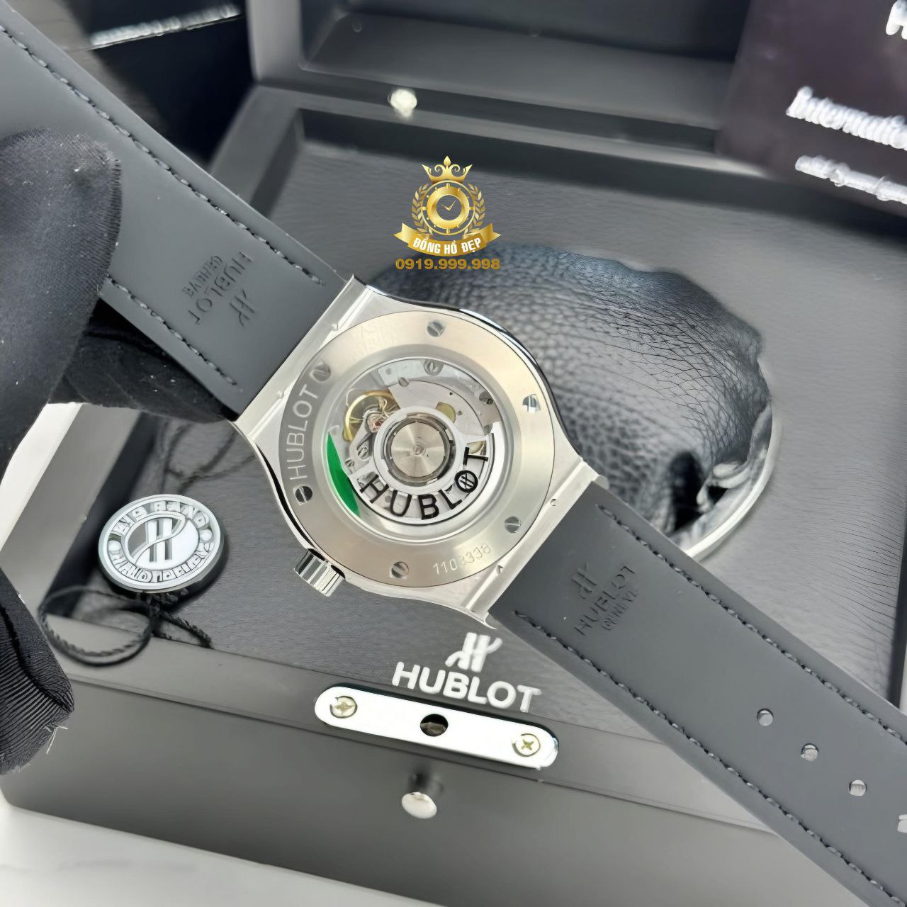 Mặt kính đồng hồ Hublot được làm từ tinh thể sapphire trong suốt có khả năng chống xước và chống phản quang tốt. Dây đeo đồng hồ kết hợp giữa chất liệu da vân cá sấu và cao su cao cấp để tạo sự thoải mái nhất cho quý ông khi đeo đến những sự kiện khác nhau.