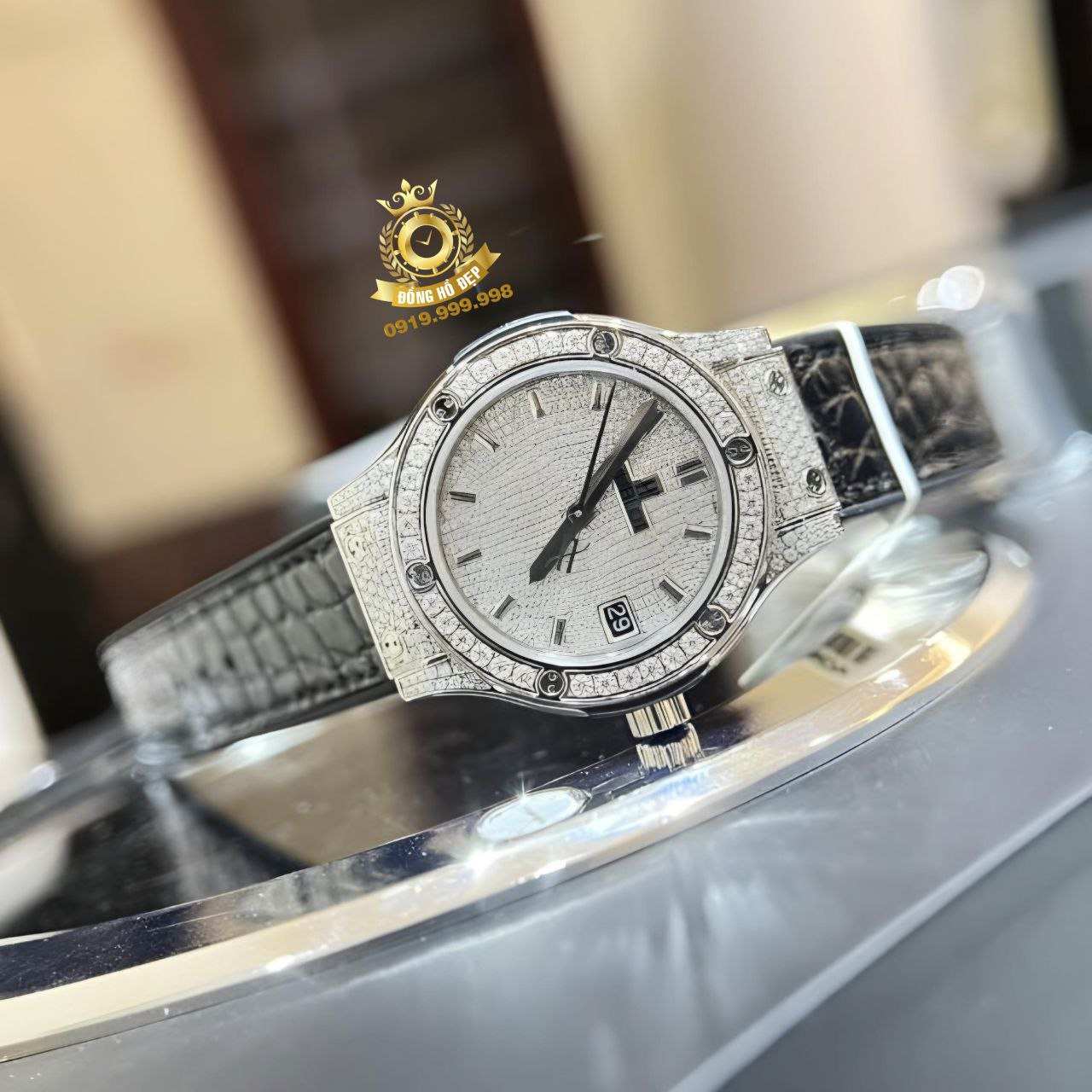 Vành bezel được cố định chắc chắn trên vỏ bằng 6 đinh vít titanium hình chữ H – đặc trưng của thương hiệu đồng hồ Hublot và được trang trí đá tròn sáng lấp lánh. Mặt số màu làm nổi bật làm nền cho bộ kim trung tâm và bộ cọc số làm từ chất liệu thép đánh bóng nổi bật. Các chi tiết được cắt gọt dứt khoát, tinh tế tạo sự sắc nét hơn cho mặt số của đồng hồ. Cửa sổ phụ báo ngày vẫn được đặt tại vị trí 3h quen thuộc để tạo sự tiện lợi theo dõi thời gian cho quý ông bận rộn.