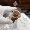 Với bộ vỏ bọc vàng hồng 18K và mặt số màu Chocolate, chiếc đồng hồ Patek Philippe Aquanaut 5167R bọc vàng mặt Chocolate có đường kính 40mm và độ dày chỉ 8.3mm. Kết hợp với chất liệu thép bọc vàng hồng 18K, thiết kế này tạo nên một cảm giác tinh tế khi đeo trên cổ tay. Bộ vỏ được hoàn thiện với những đường chải xước, duy trì dáng Cushion ghép giữa hình vuông và các góc bo tròn. Viền ngoài mặt số có các mốc chỉ phút được sơn trắng nổi bật. Trên mặt số, các cọc số và kim giờ phút được chế tác từ vàng hồng, trong khi kim giây có màu trắng. Khi ánh sáng đủ mạnh hoặc trong điều kiện tắt đèn, tất cả các cọc số, kim và các mốc chỉ phút sẽ sáng rực, giúp người dùng dễ dàng quan sát thời gian.