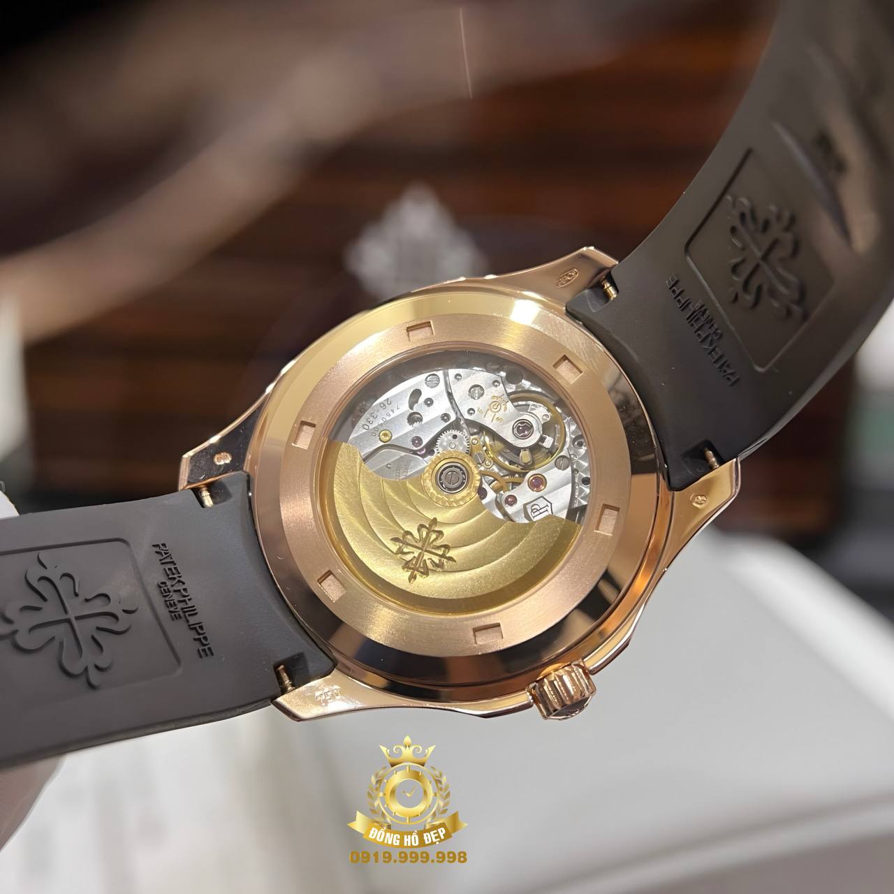Để đạt được độ mỏng ấn tượng như trên, đồng hồ Patek Philippe Aquanaut 5167R Replica cao cấp sử dụng bộ máy Caliber 324 S C. Mặt đáy bằng sapphire cho phép người dùng nhìn thấy bộ máy cơ học này, với chi tiết nổi bật là rotor bằng vàng khối, được khắc logo thương hiệu. Caliber 324 S C là một bộ máy đã được sử dụng rộng rãi bởi Patek Philippe, có tần số 28,800 vph và thời lượng cót khoảng 45 giờ.