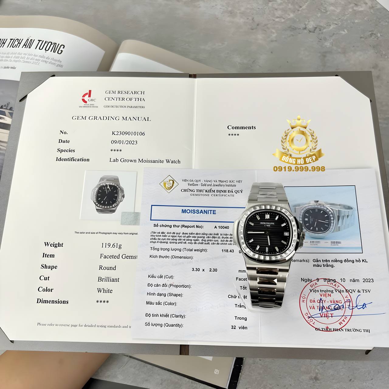 | Chất liệu vỏ | Thép không gỉ – Kim cương Moissanite |