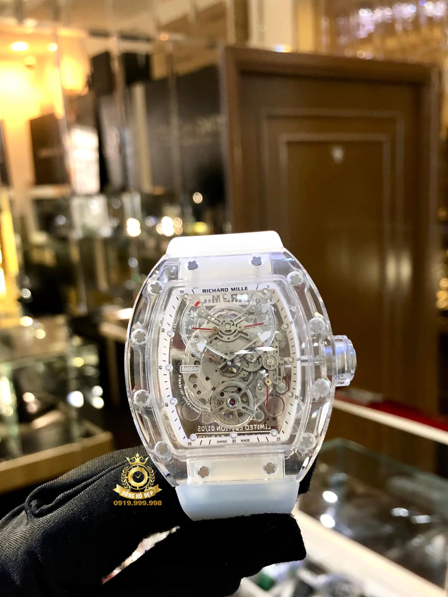 Phiên bản giới hạn 5 chiếc. Thương hiệu đã sử dụng kinh nghiệm dày dặn về quá trình tạo khung và chế tạo các thành phần bằng tinh thể sapphire (Al 2 O 3 ), có được trong quá trình nghiên cứu cho cả RM 018 ‘Hommage to Boucheron’ , có tấm đế và cầu nối bằng vật liệu này, và vỏ của RM 056 để tạo ra RM 56-01, được đặc trưng bởi chuyển động trong suốt đặc biệt của nó.