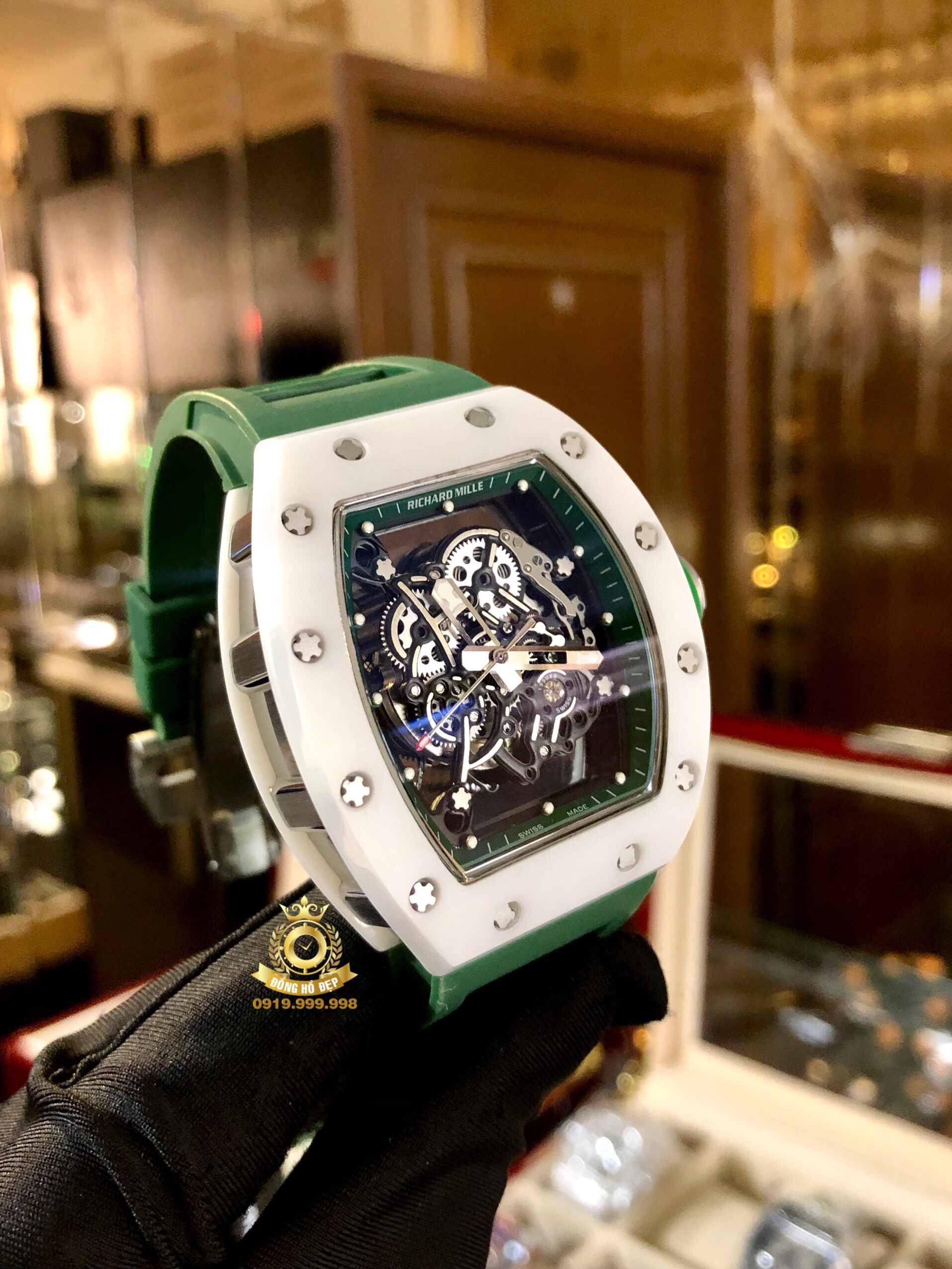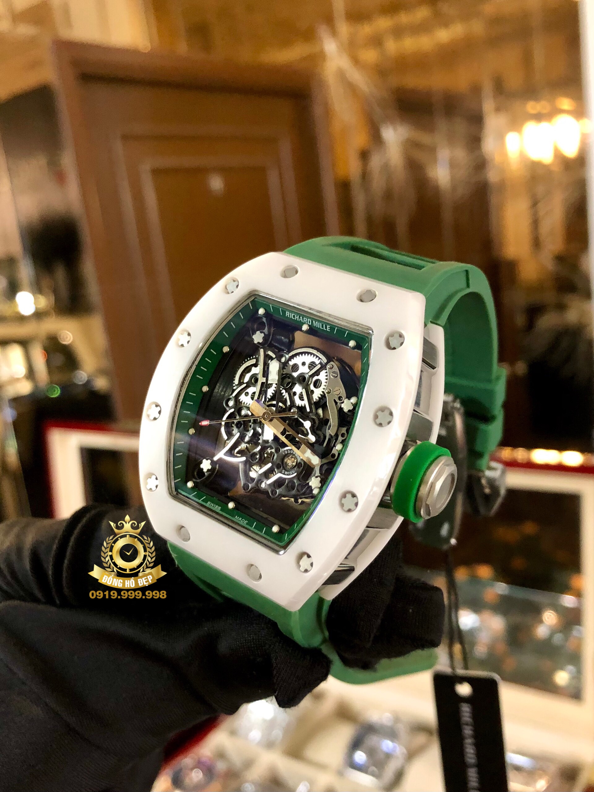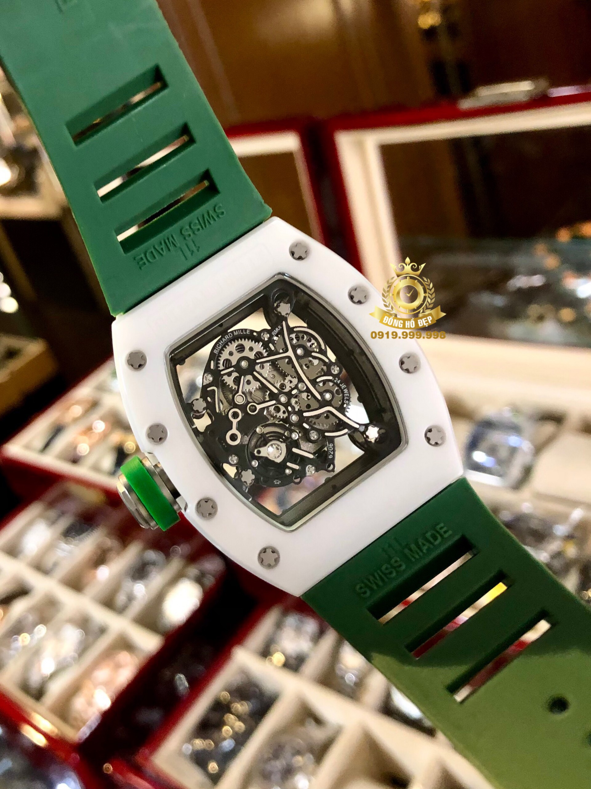 Đánh giá Richard Mille 055 Green Strap White Ceramic Bezel.