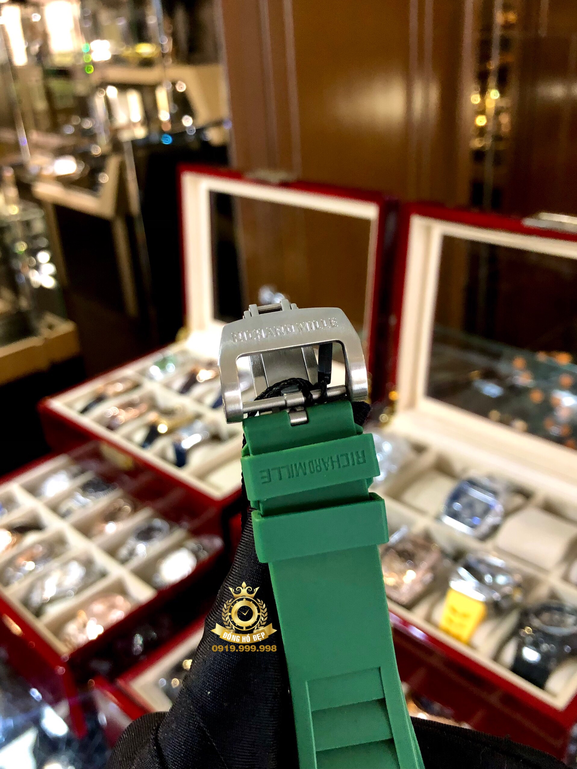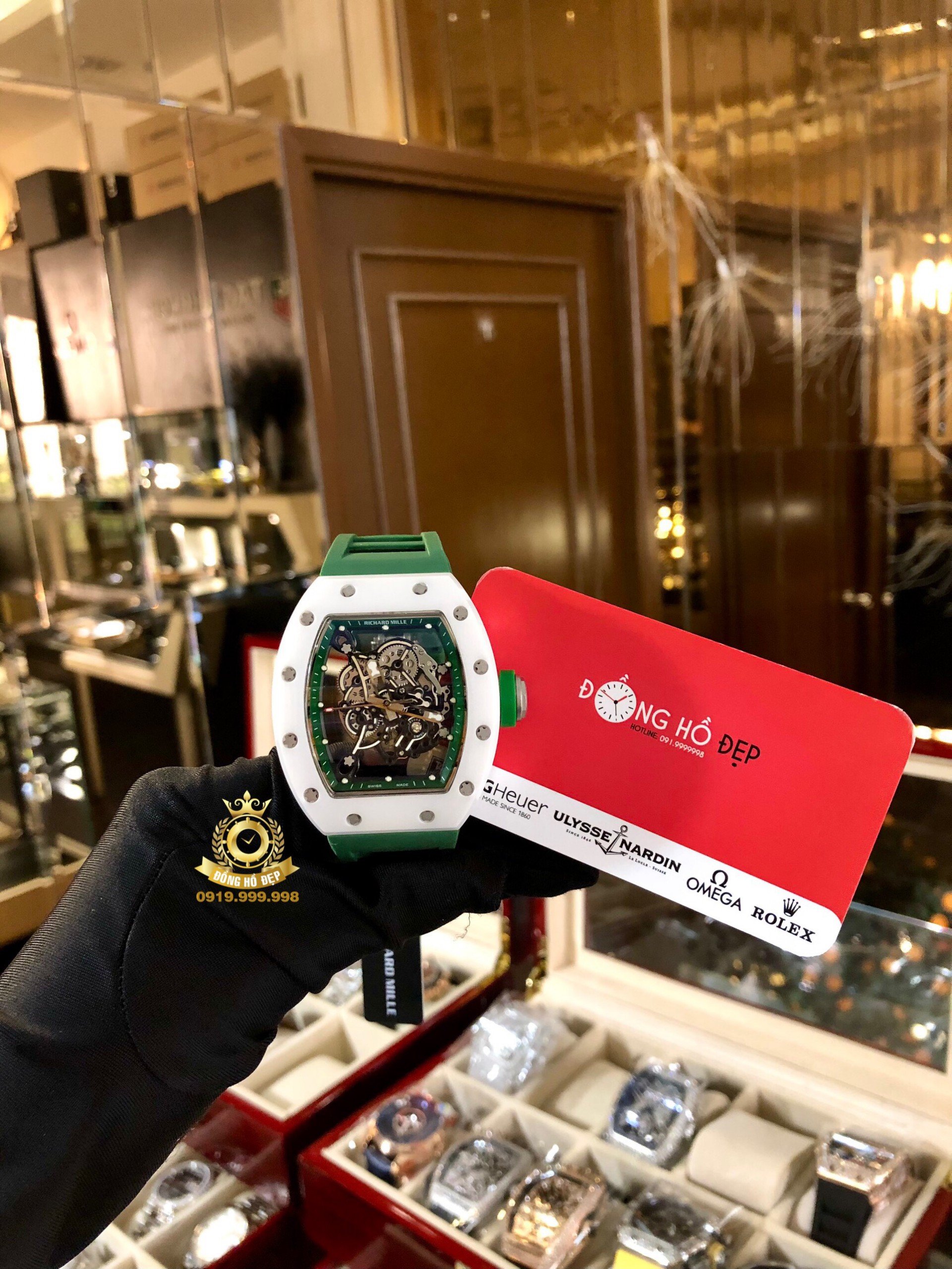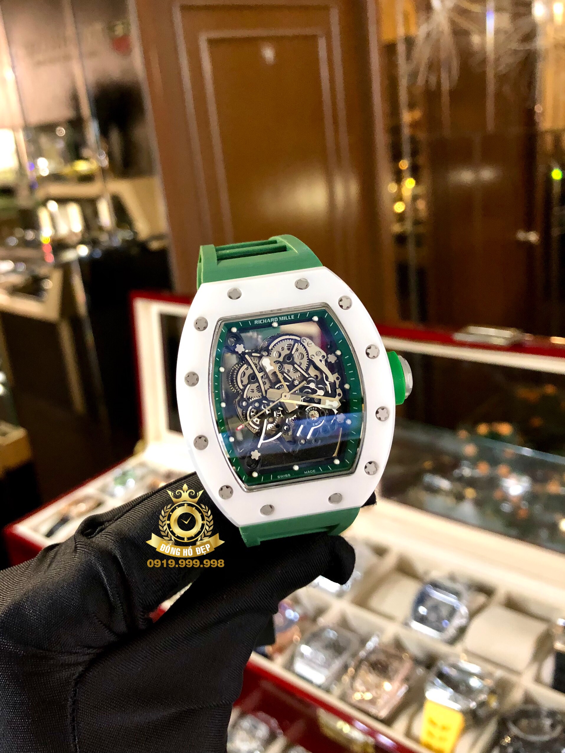 Đánh giá Richard Mille 055 Green Strap White Ceramic Bezel.