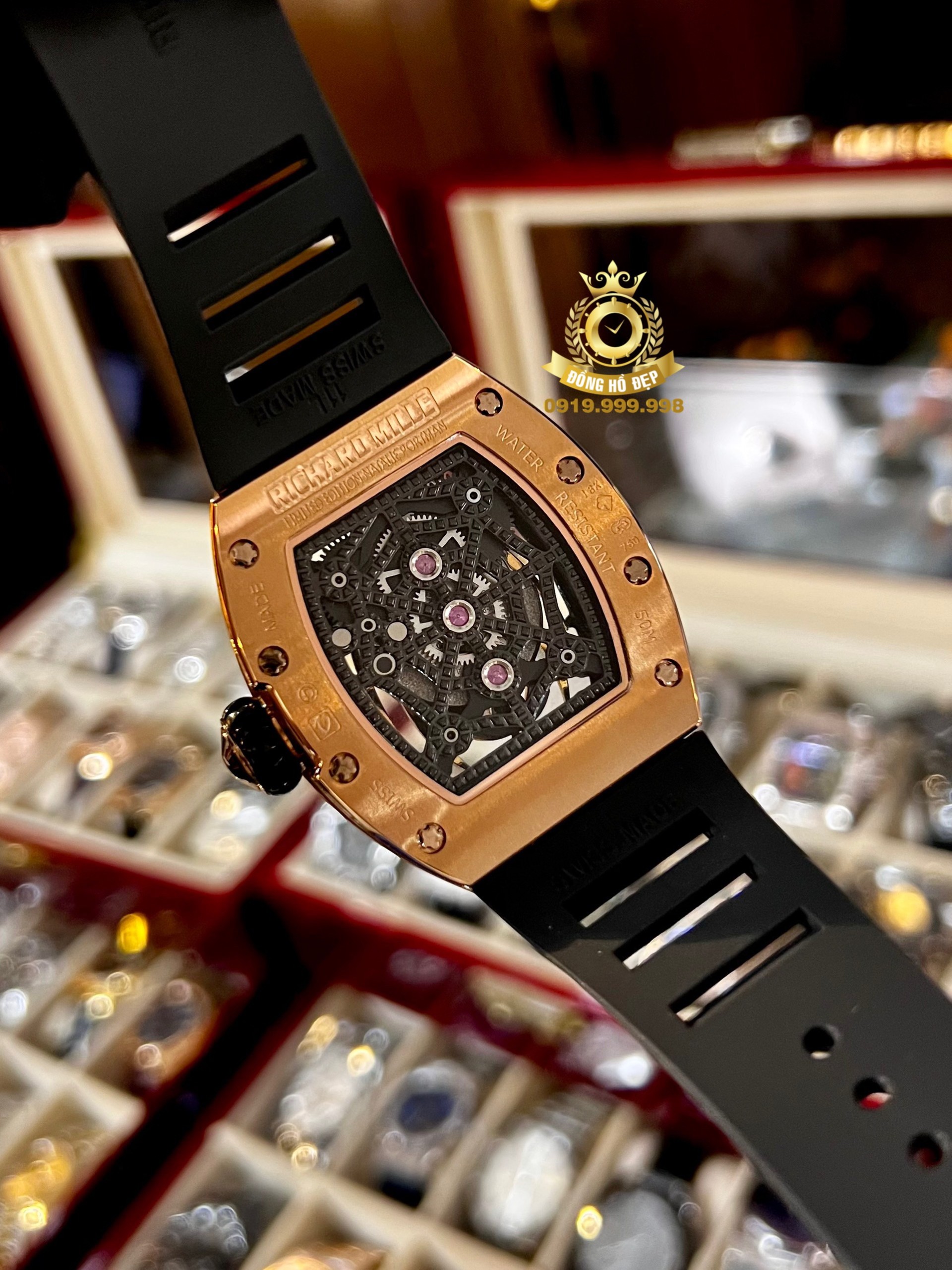 Dây đeo của đồng hồ được làm từ chất liệu cao su tự nhiên, mềm mại và bền chắc, thoáng mát. Kết hợp với bộ dây cao su là bộ khóa gập quen thuộc của thương hiệu Richard Mille. Thiết kế khóa được hoàn thiện cùng chất liệu với bộ vỏ đem đến cái nhìn tổng hòa cho tổng thể thiết kế. Khóa gập này giúp người dùng thuận tiện trong việc sử dụng đồng thời đảm bảo được tính an toàn trong việc giữ đồng hồ chắc chắn trên cổ tay của bạn.
