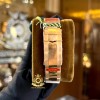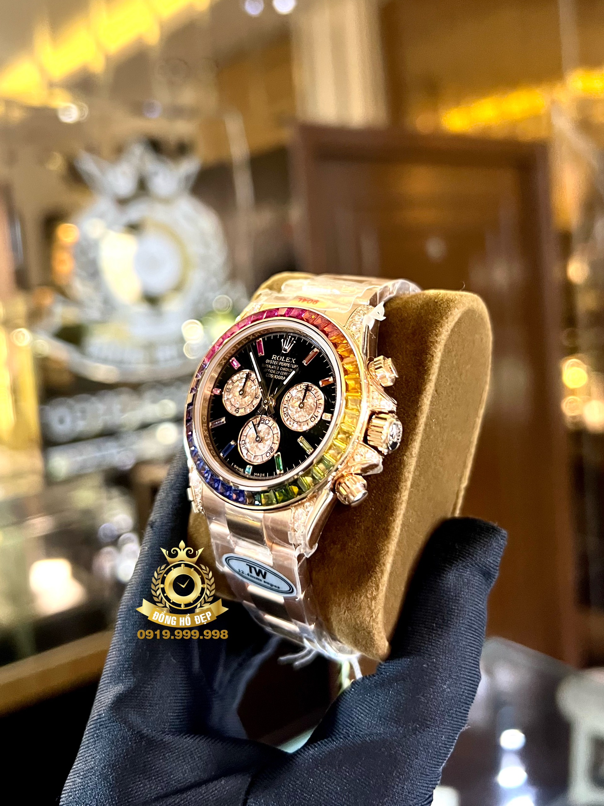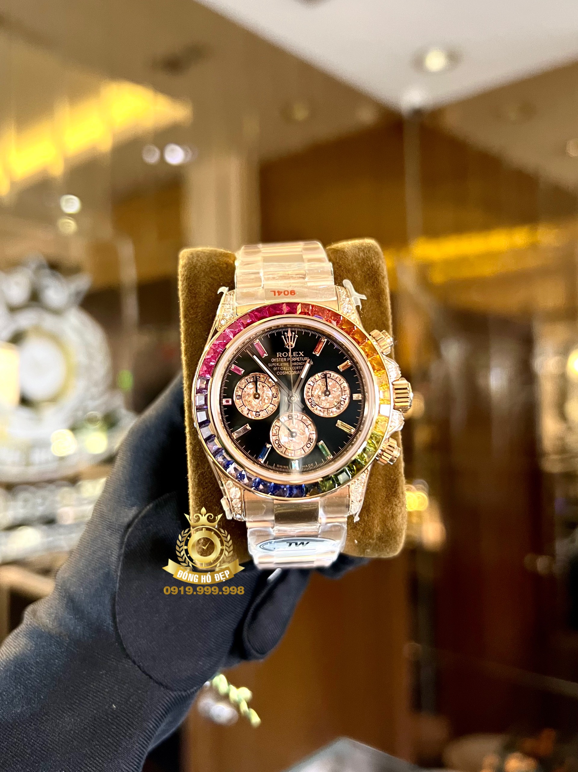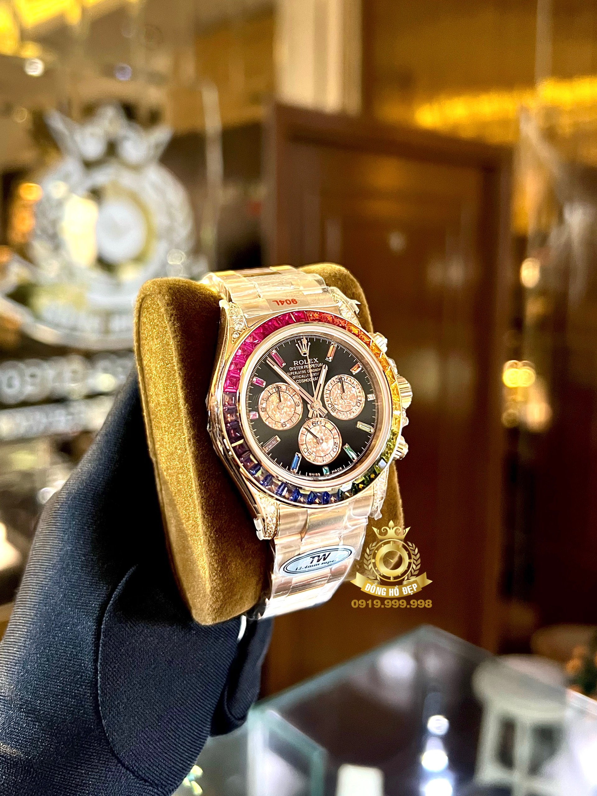 chiếc đồng hồ Rolex Daytona Rainbow Rose Gold có vành bezel nổi bật với 7 sắc cầu vồng: đỏ, cam, vàng, lục, lam, chàm, tím được đính 36 viên kim cương ống, thay cho vành Tachymeter thường thấy trên dòng đồng hồ Daytona.
