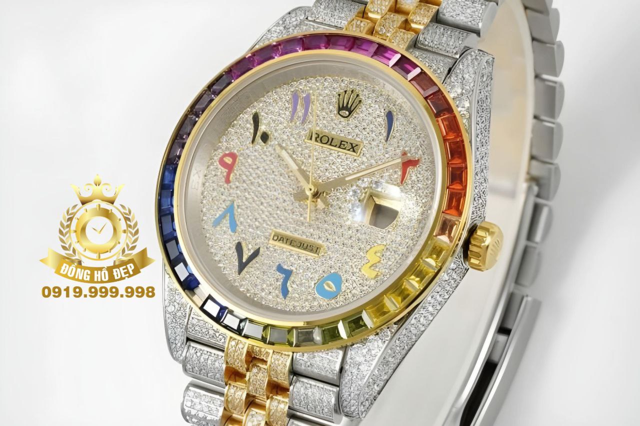 Đánh giá Rolex DateJust Arabic Line Rainbown Full Diamond Demi Gold.