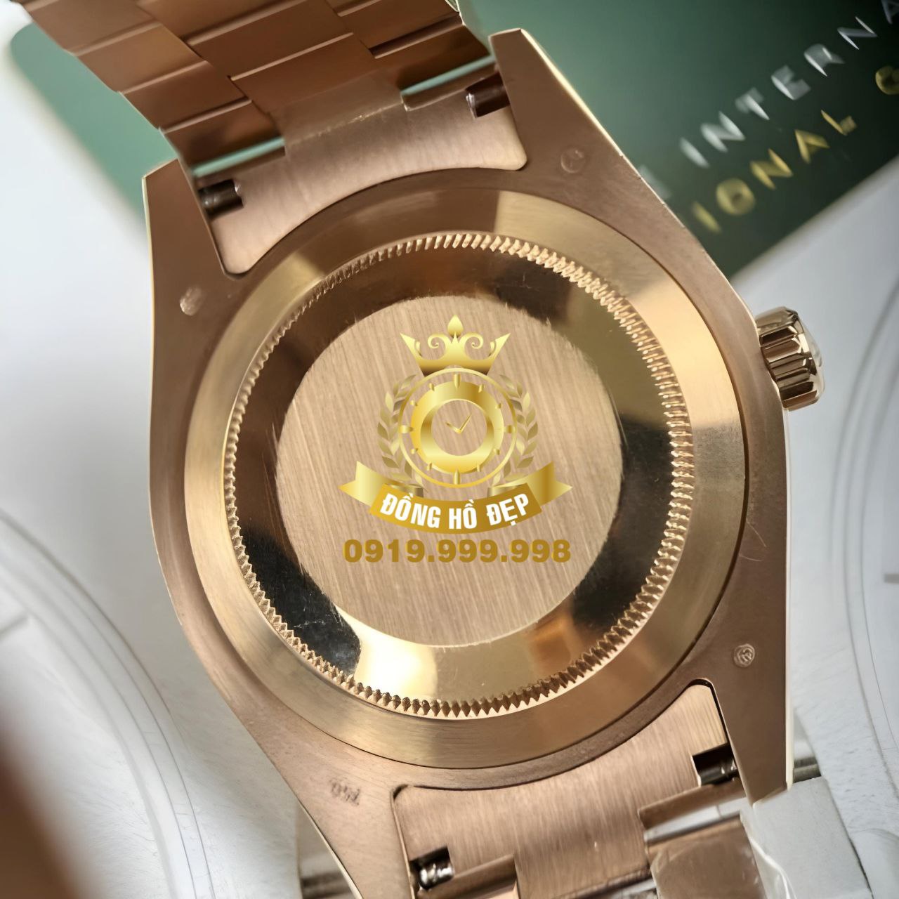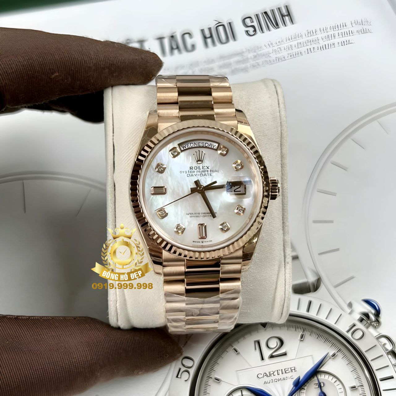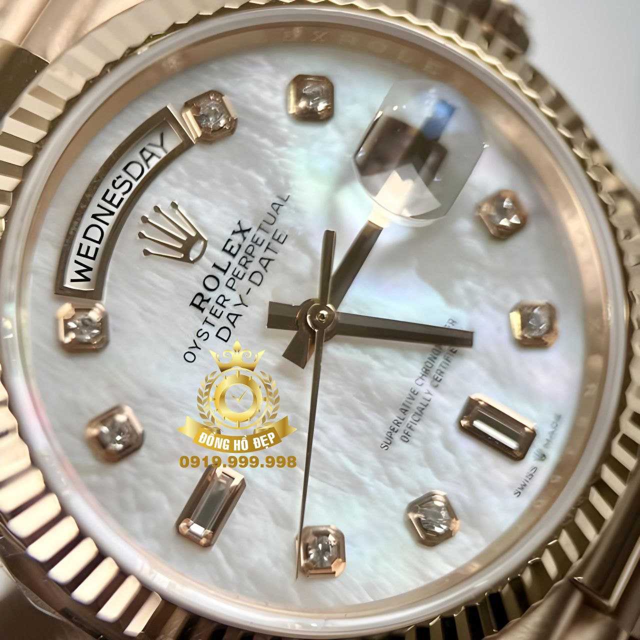 Đánh giá Rolex Day-Date Mặt Xà Cừ Cọc Số Đính Đá Rose Gold.