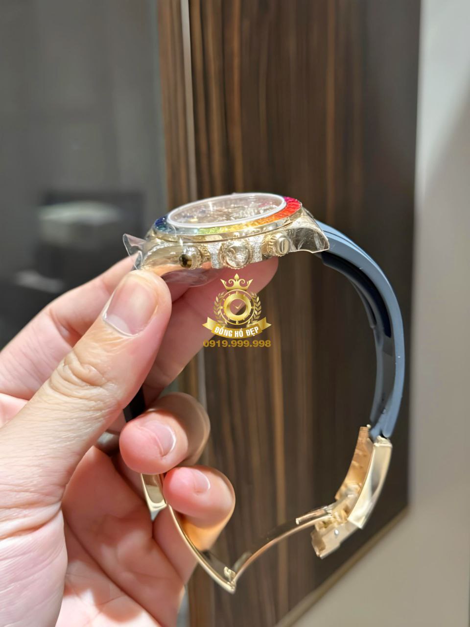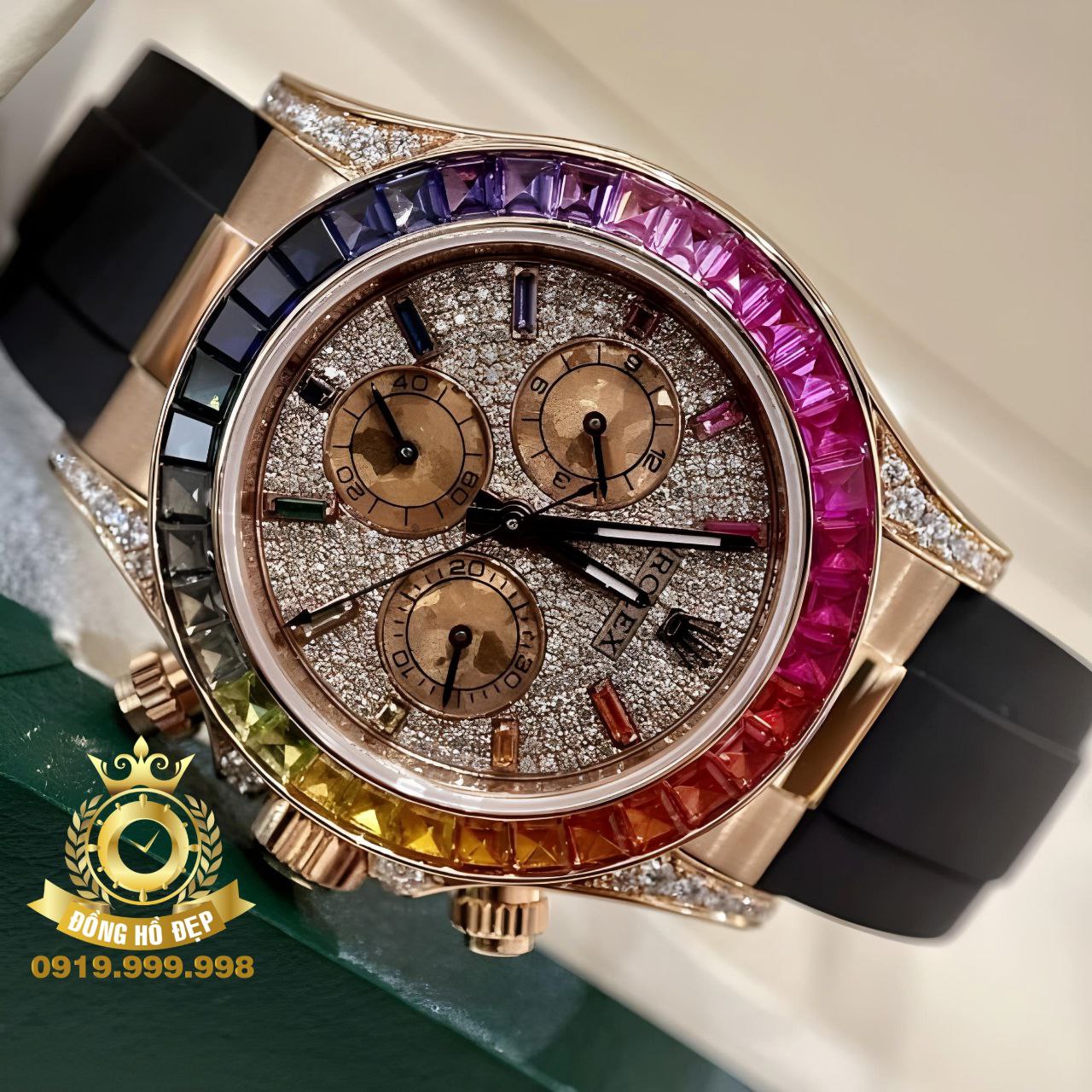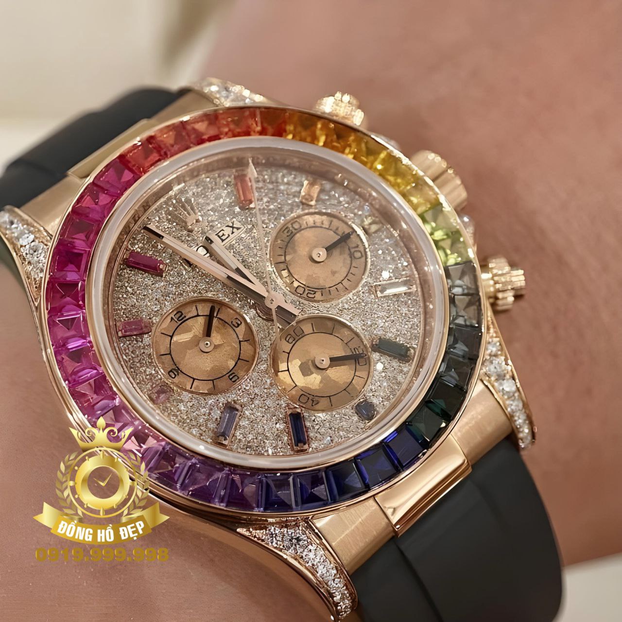 Chiếc đồng hồ Rolex Daytona Rainbow Rose Gold có vành bezel nổi bật với 7 sắc cầu vồng: đỏ, cam, vàng, lục, lam, chàm, tím được đính 36 viên kim cương ống, thay cho vành Tachymeter thường thấy trên dòng đồng hồ Daytona.