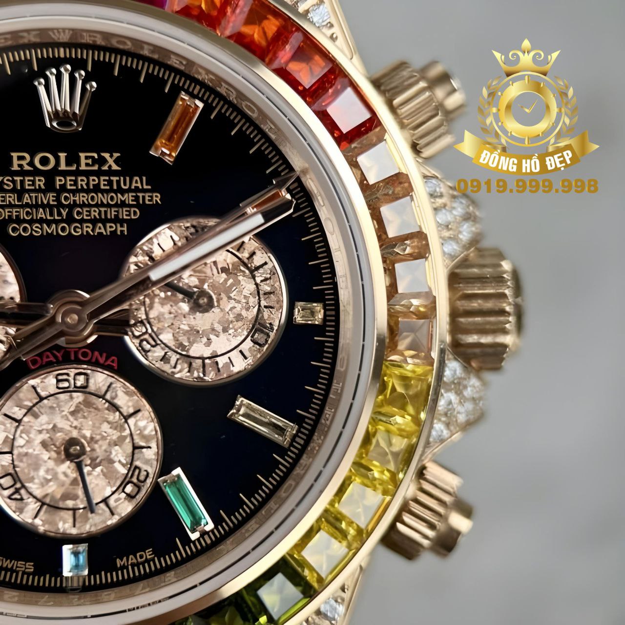 Chiếc đồng hồ Rolex Daytona Rainbow Rose Gold có vành bezel nổi bật với 7 sắc cầu vồng: đỏ, cam, vàng, lục, lam, chàm, tím được đính 36 viên kim cương ống, thay cho vành Tachymeter thường thấy trên dòng đồng hồ Daytona.