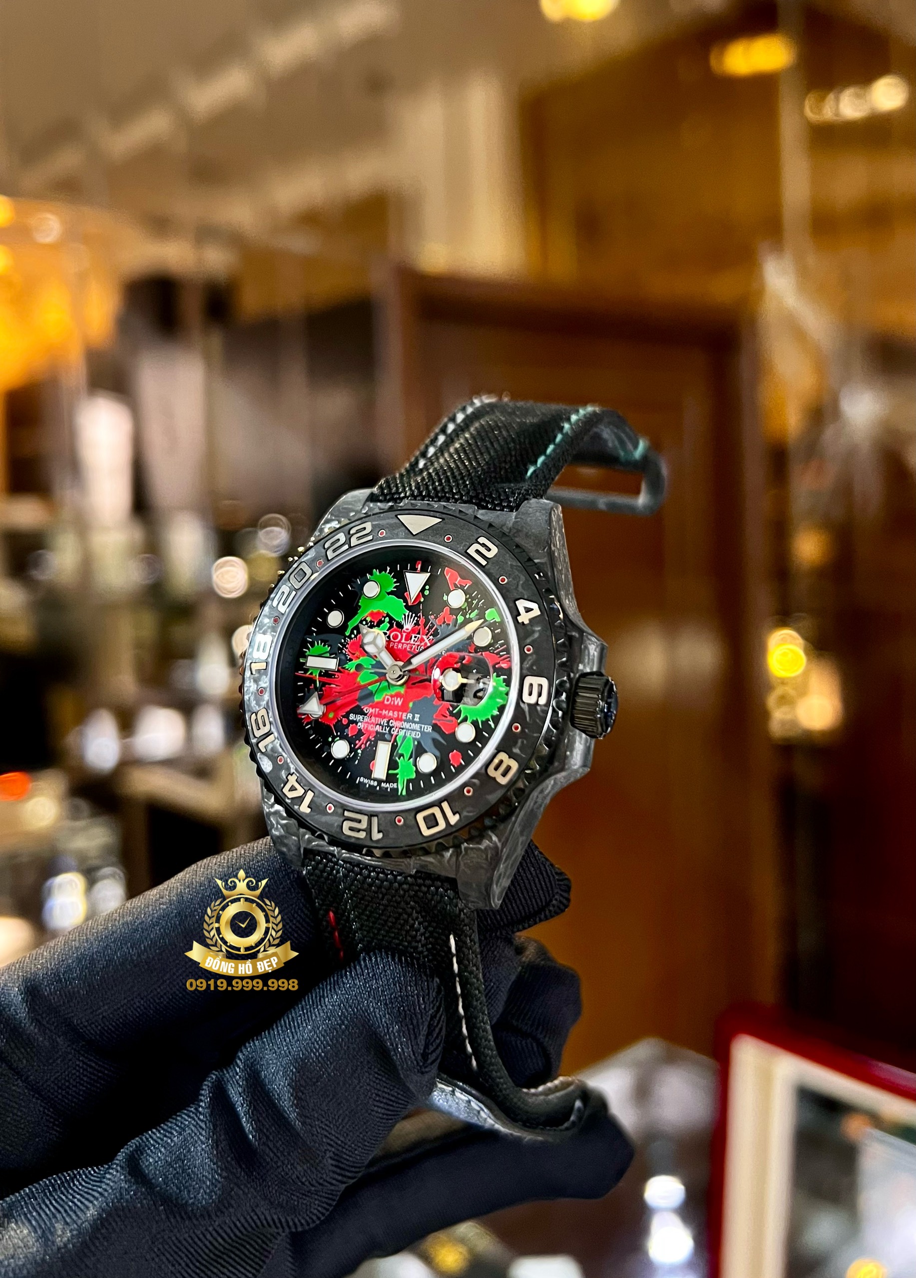 Đánh giá Rolex DiW NTPT Carbon GMT-Master II “MOTLEY GMT”