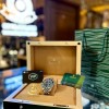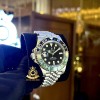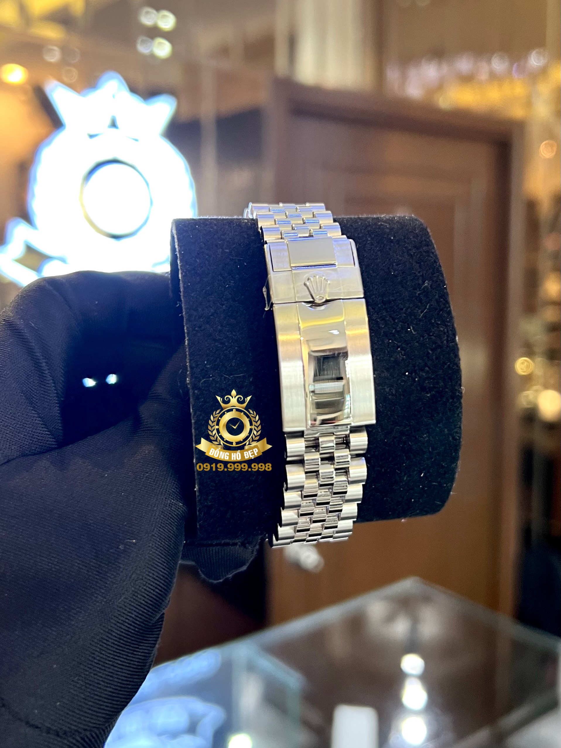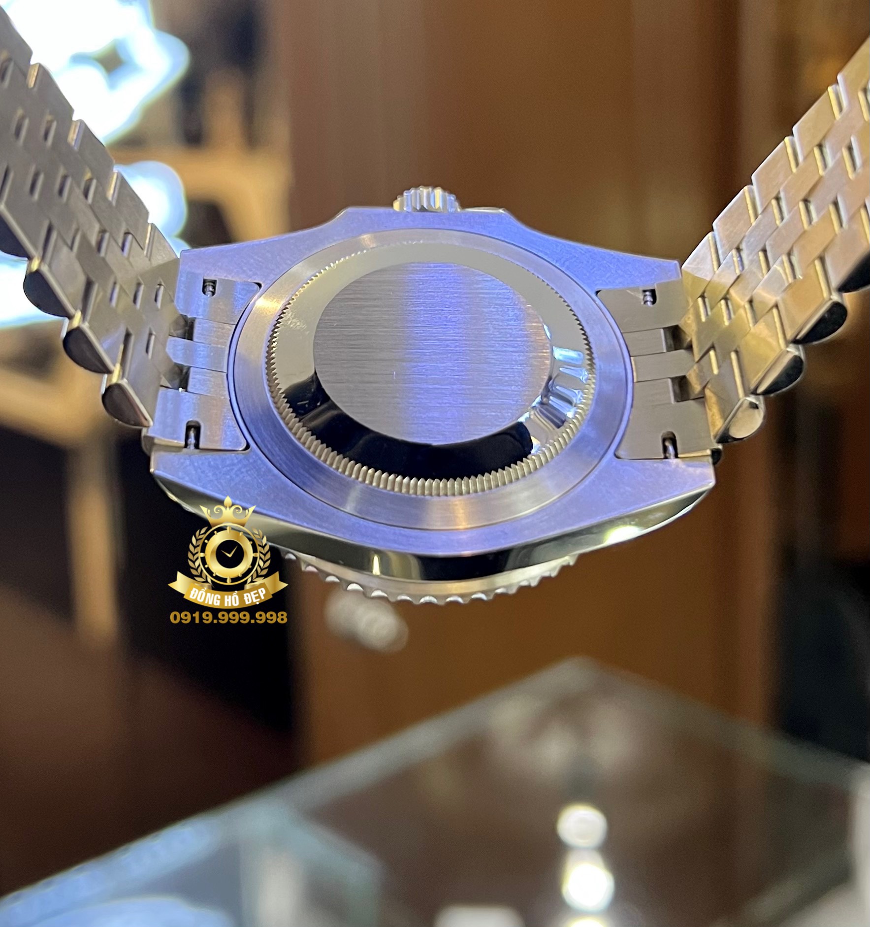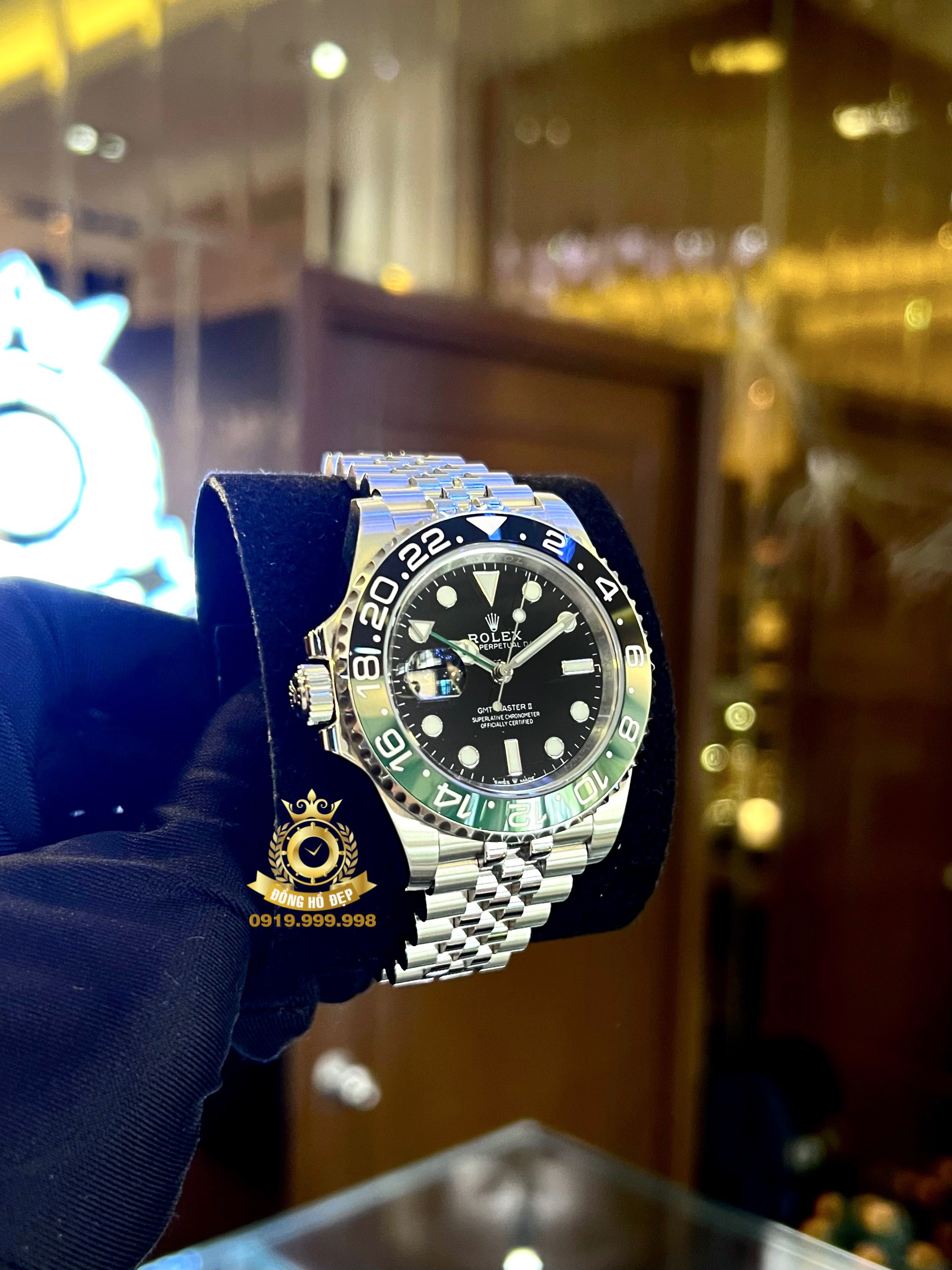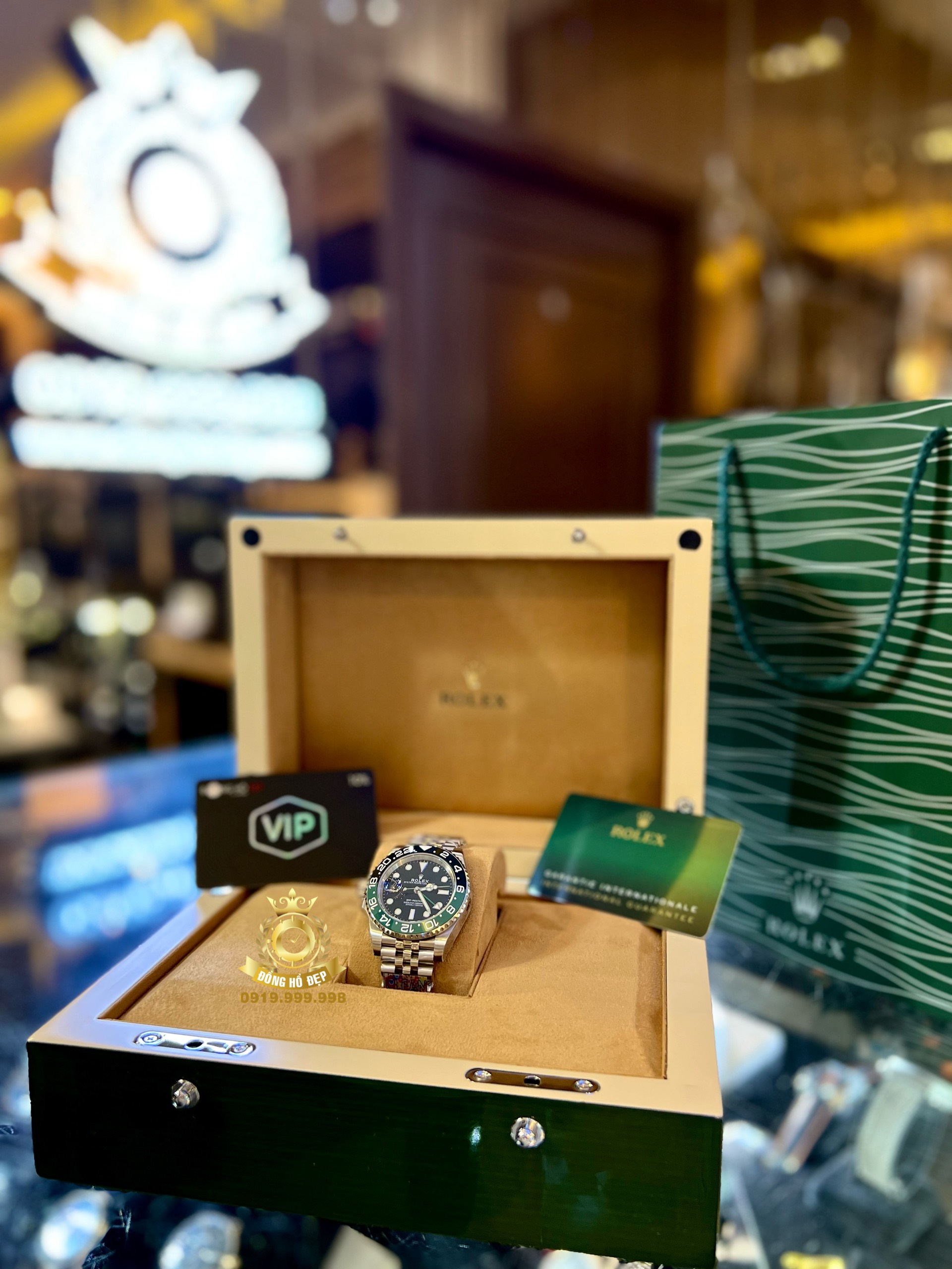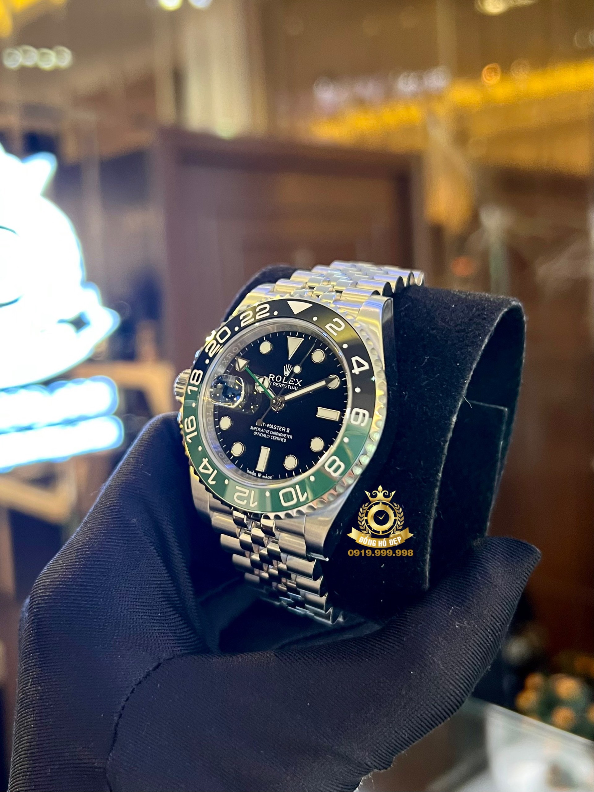 Đến từ thương hiệu Rolex, có kích cỡ mặt số 40 mm dành cho các quý ông lịch lãm. Chiếc đồng hồ sử dụng bộ máy tự động có xuất xứ Thụy Sĩ, đồng hồ có thể vận hành trong thời gian dài, có độ bền và giá trị sưu tầm cao. Chất liệu vỏ được chế tác từ thép có độ bền cao và vẻ ngoài sang trọng. Đồng hồ được trang bị dây kim loại bền bỉ, lịch lãm. Chất liệu kính làm từ Sapphire đem lại khả năng chống xước, chống lóa tuyệt vời.Mặt số sơn mài đen có kim bằng vàng trắng 18K với các kim chỉ hình tròn, hình chữ nhật và hình tam giác. Kim GMT được sơn mài màu xanh lá cây. Tất cả các kim và vạch giờ đều được làm đầy bằng Chromalight, mang đến màu xanh lam nổi bật thấu kính Cyclops qua thời đại