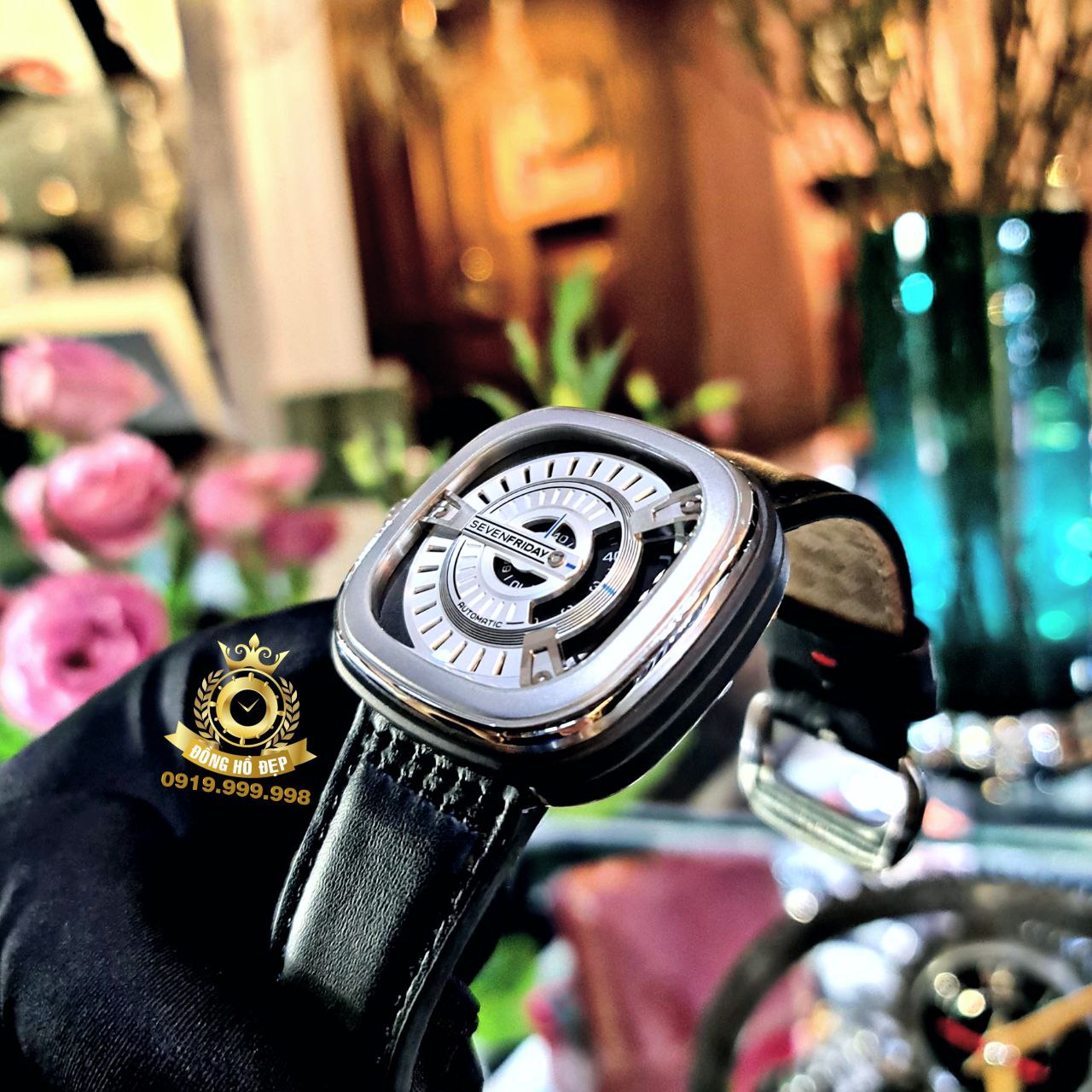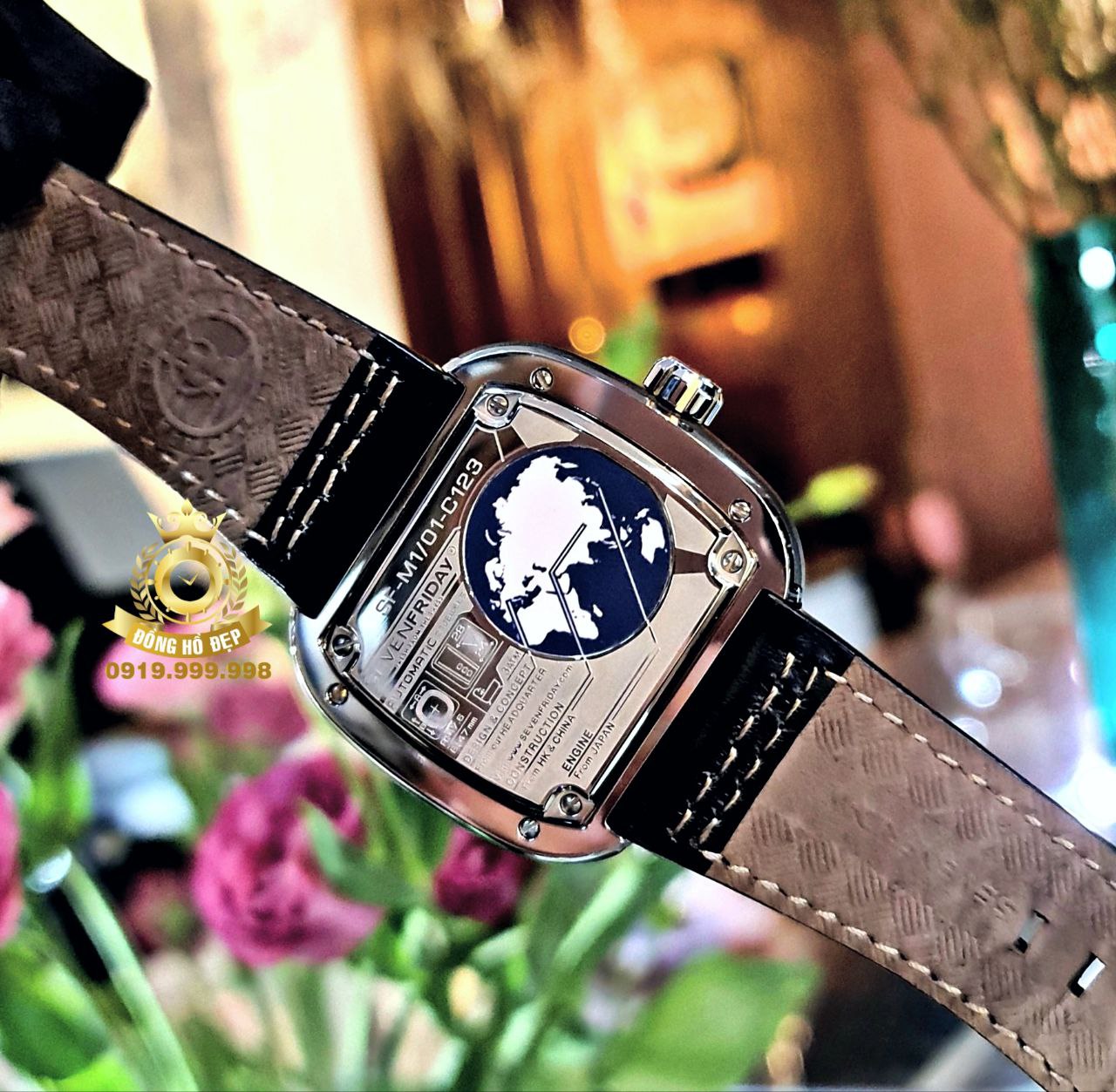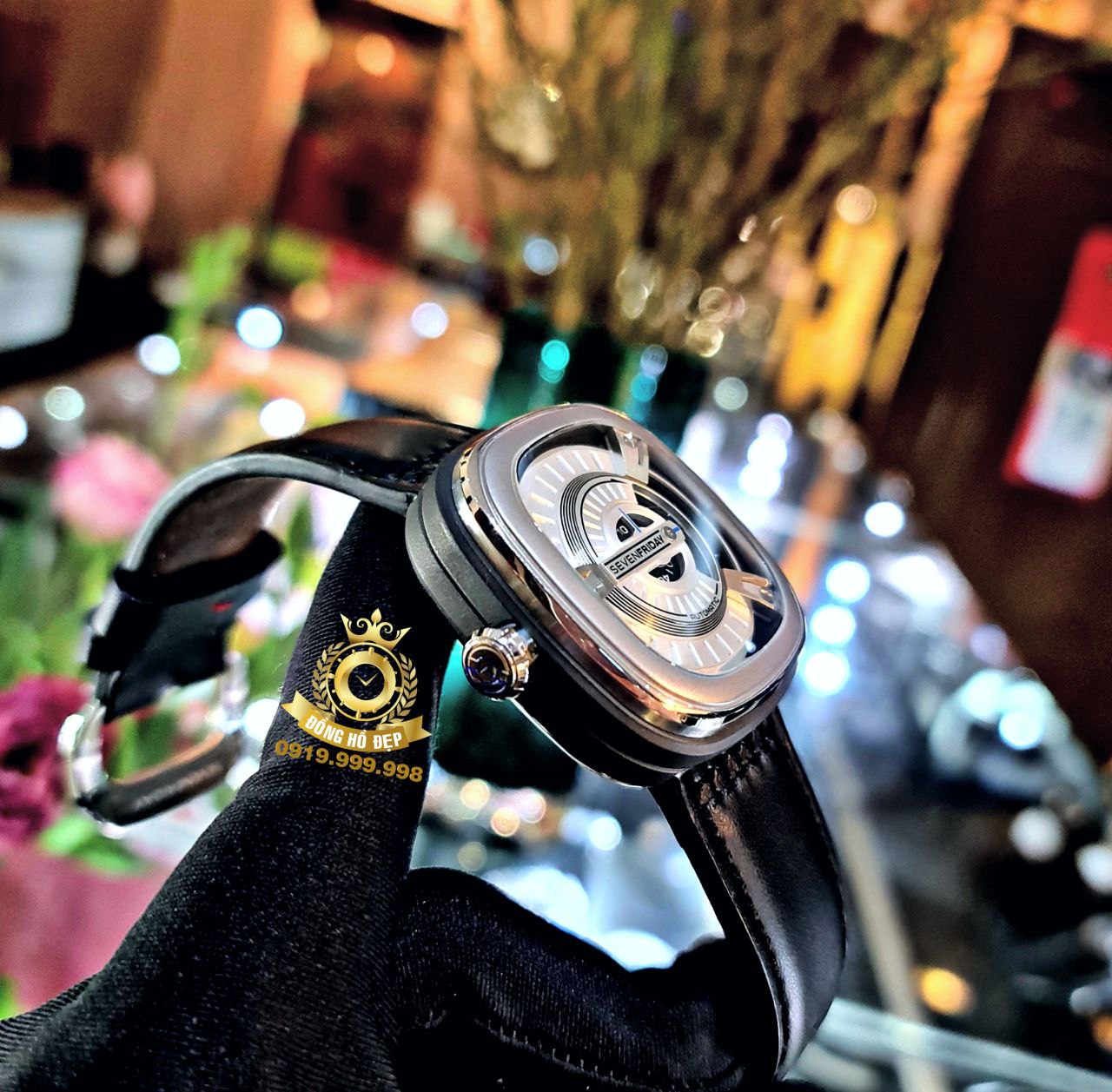 Với khả năng xoay mượt mà của các con số được in bằng màu bột vàng kết hợp với nền đen phun cát giúp việc xem giờ trở nên dễ dàng hơn và các ổ đỡ được cố định tại một vị trí làm nổi bật 7 lớp luân phiên được ứng dụng kim loại mạ điện và rhodium khác nhau tạo chiều sâu trên giao diện.SevenFriday M1/ có đường kính 47×47.6 mm và dày 11.3mm với thiết kế oversize – hình vuông với các góc và hai bên luôn vát hơi cong trông rất lôi cuốn và thu hút giúp cho chiếc đồng hồ này cũng trở thành xu hướng được nhiều người ưa chuộng.Đi cùng với bộ dây đeo được làm bằng chất liệu da cao cấp màu nẫu với những mũi khâu màu đen ton-sur-ton dễ dàng cho các quý ông kết hợp cùng những bộ suit sang trọng hay trang phục thường ngày.