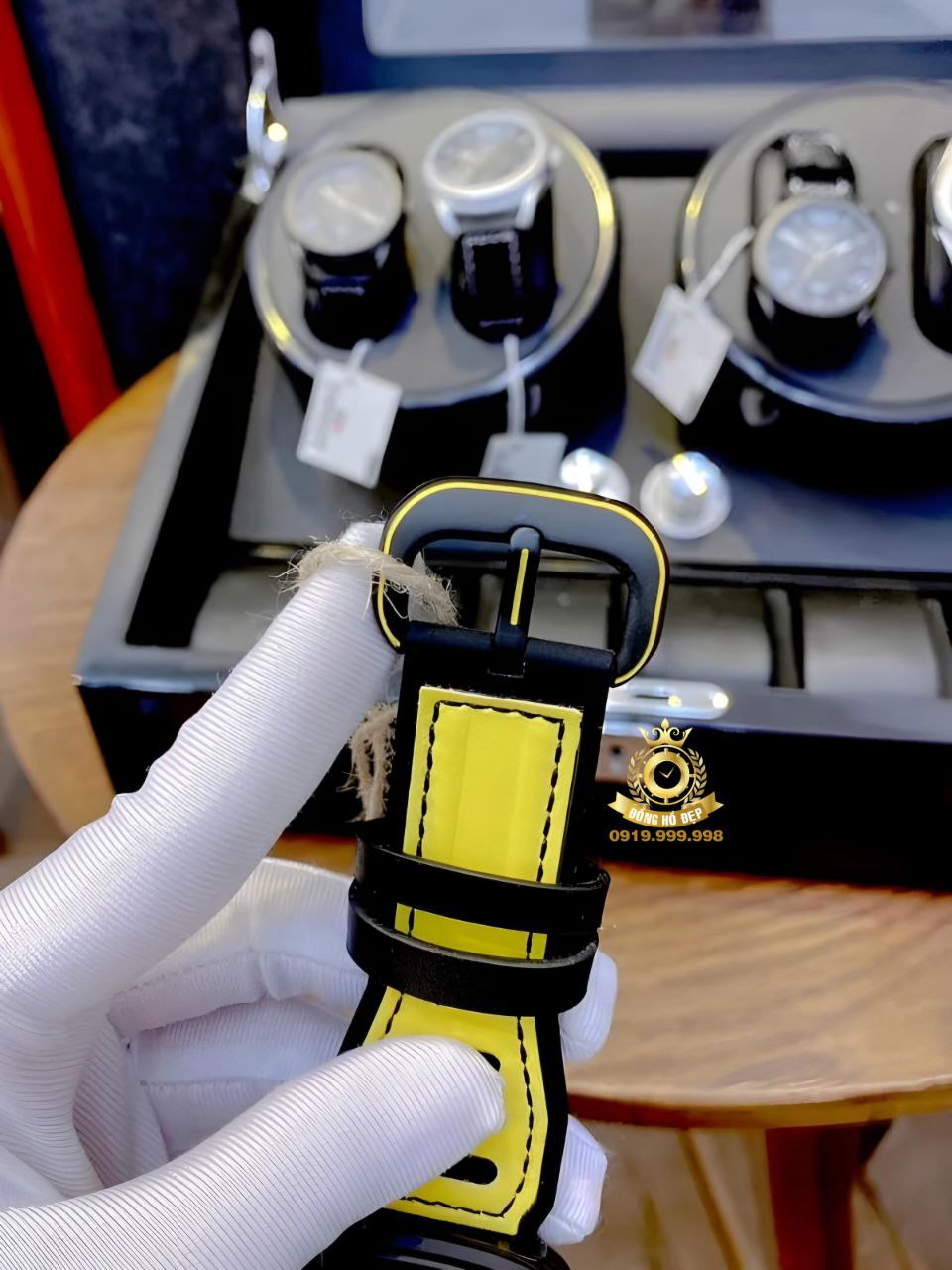 Lần đầu tiên mặt số lộ cơ đa lớp signature của P-Series được thiết kế bằng sợi carbon – chất liệu được các nhà sản xuất siêu xe ưa chuộng hiện nay, tạo hiệu ứng thị giác 3D ấn tượng.Ngay cả đĩa giây và đĩa 24h cũng đều được được thiết kế dựa trên công tơ mét của những chiếc xe đua thể thao. Đặc biệt, kim giờ và kim phút được phủ Super-Luminova phát quang, giúp người đeo tiện theo dõi giờ ngay cả trong môi trường thiếu sáng.Cách phối màu vàng – đen của mẫu P3B/03 chính là đại diện tiêu biểu cho lối sống năng động, thú vị và tràn đầy niềm đam mê bất tận với tốc độ của phái mạnh. Đồng thời, dây đeo cao su pha với lớp da lót đệm màu vàng vừa ôm tay, vừa gạt bỏ đi nỗi lo về mồ hôi hay dị ứng, giúp P3B/03 đem lại cảm giác thoải mái tuyệt đối mỗi khi diện trên tay chủ nhân.