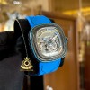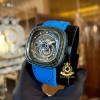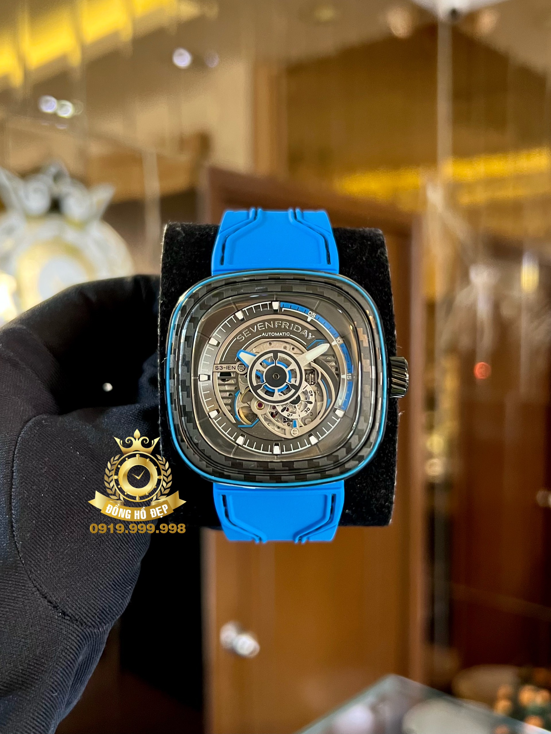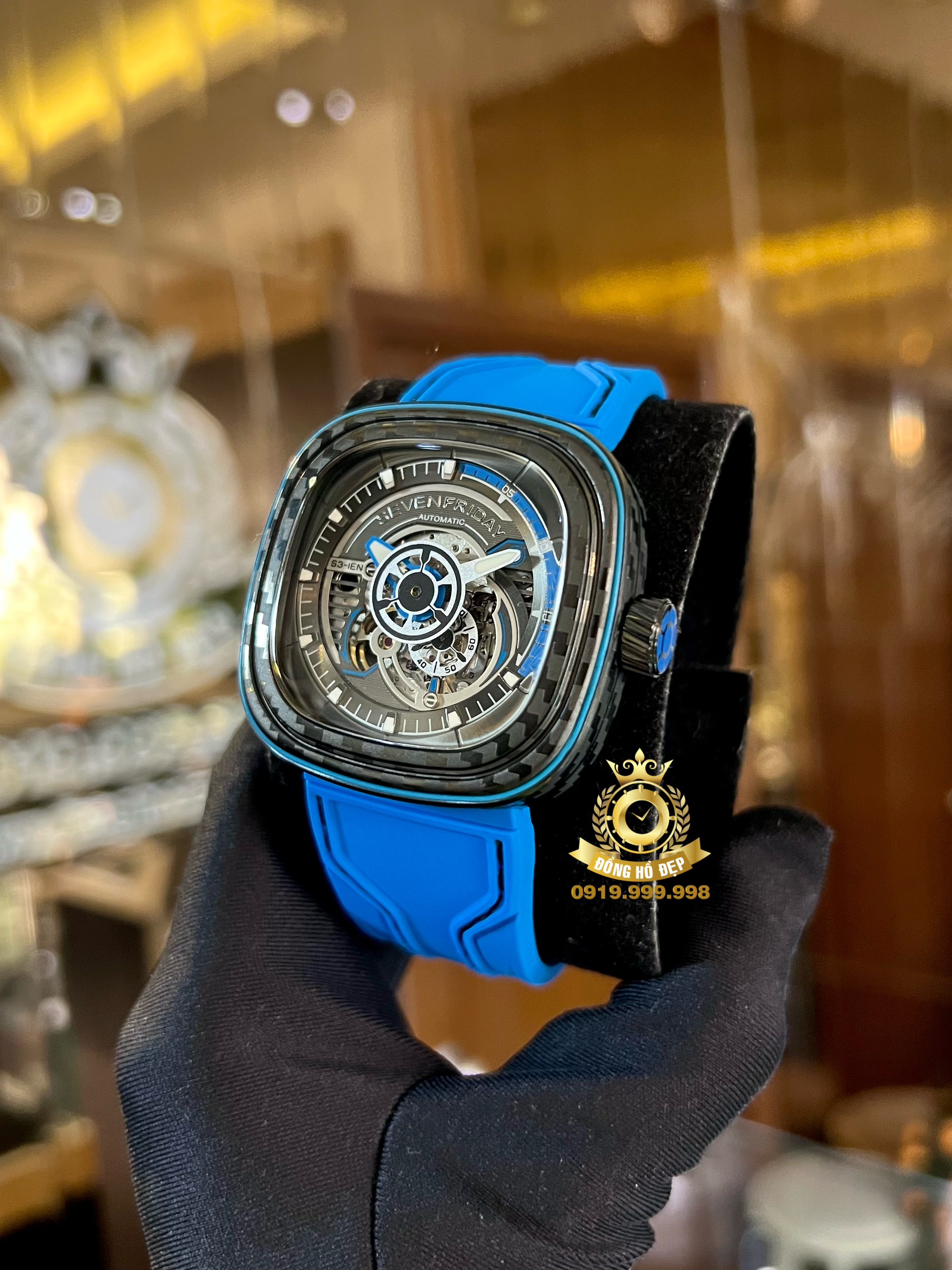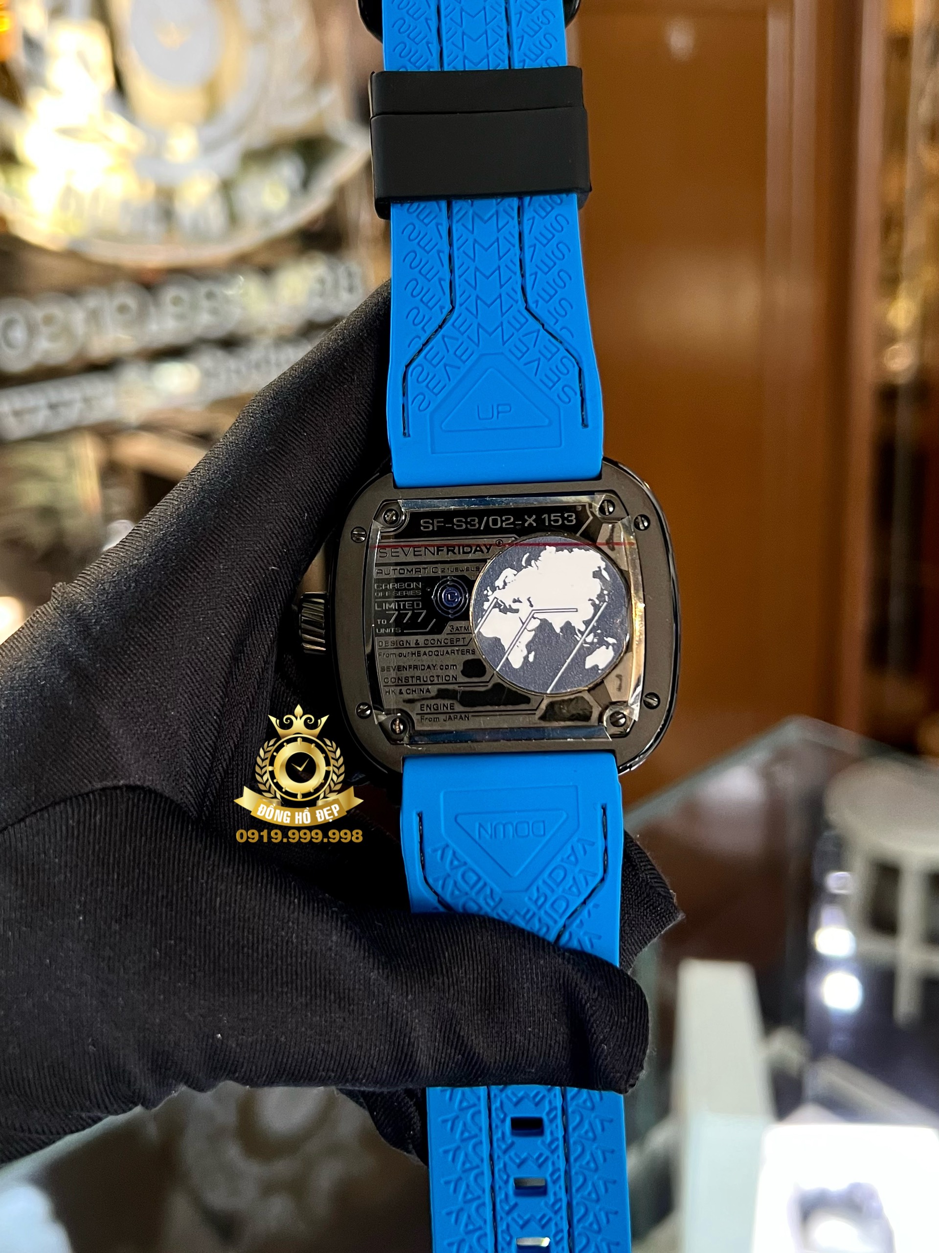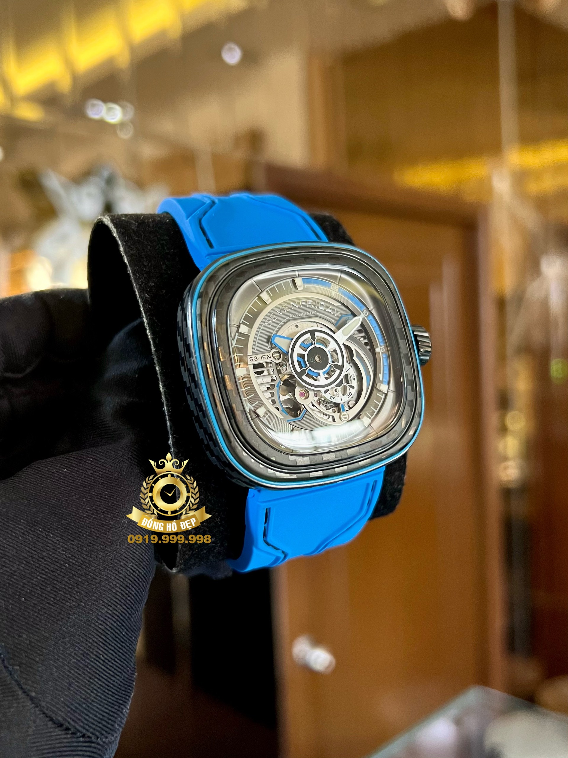 Bên cạnh đó, mẫu đồng hồ màu đen/xanh này được hãng trang bị chiếc kim giờ màu trắng ở giữa mặt số. Kim phút màu bạc được phủ màu trắng và các cọc số được phủ chất phát quang màu trắng trên vòng số đen mờ, giúp người đọc có thể quan sát rõ ràng hơn trong mọi điều kiện ánh sáng.Đặc biệt, vẫn mang nét tương đồng với “người anh em” S3/01, mẫu đồng hồ S3/02 sở hữu mặt số skeleton sắc nét, trên mặt số phụ tại góc 7 giờ người đeo có thể quan sát được bộ máy Miyota 82S5 chuyển động nhịp nhàng ẩn sau viền đĩa đa lớp.Tiếp tục chứng minh khả năng chinh phục những yếu tố thẩm mỹ đương đại theo cách rất riêng của mình, SevenFriday S3/02 sở hữu phối màu xanh và ghi đen từ Carbon Fiber cùng với hiệu ứng 3D dưới nhiều góc độ chắc chắn sẽ làm “siêu lòng” cộng đồng fan của SevenFriday chỉ qua cái nhìn đầu tiên.